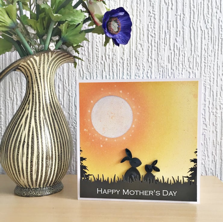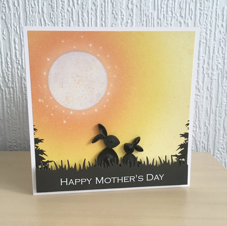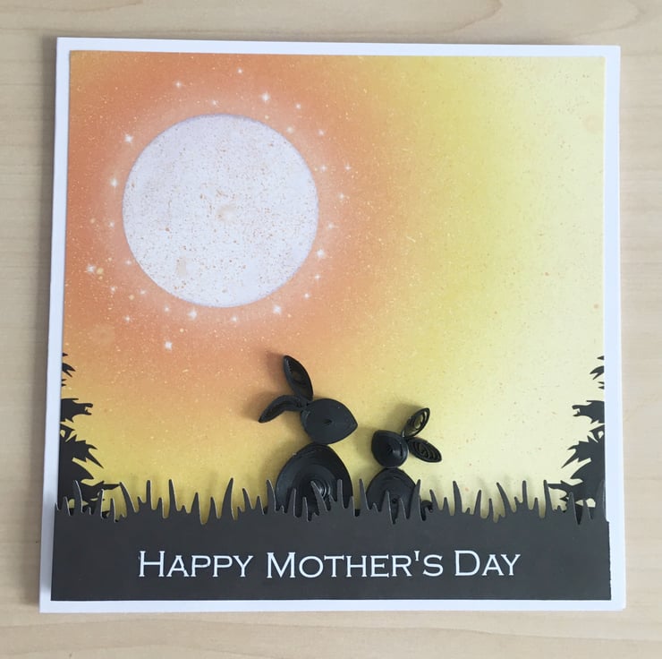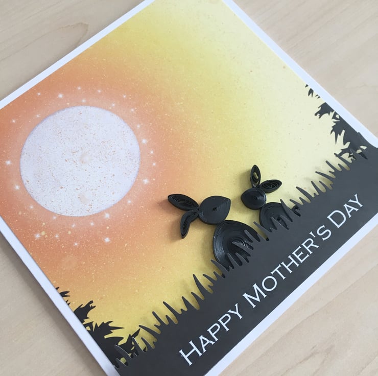 This card features a quilled mother rabbit with her rabbit-child who is gazing up at her during a beautiful moonlit night. After all, a mum is a beautiful sight to a child.