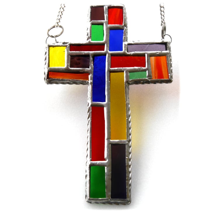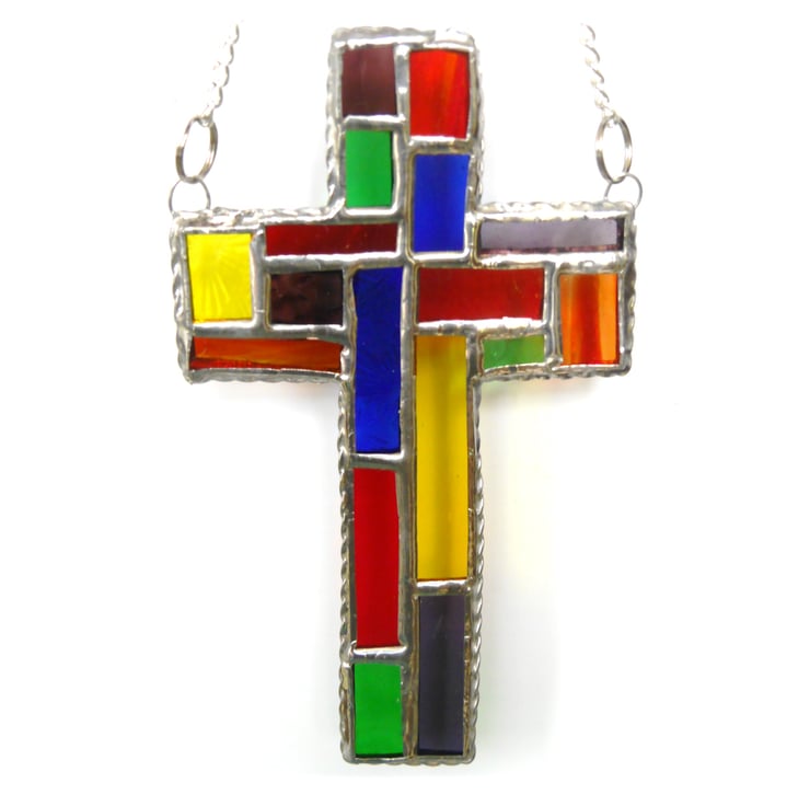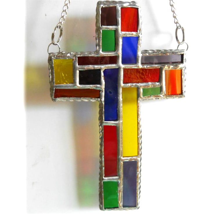 It is a simple cross shape but the patchwork arrangement of colours is classic stained glass design.
