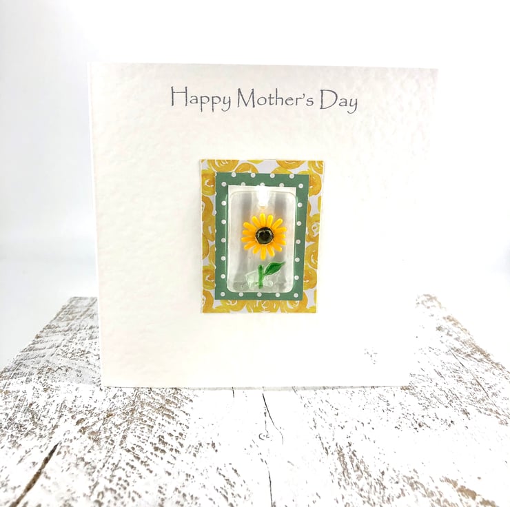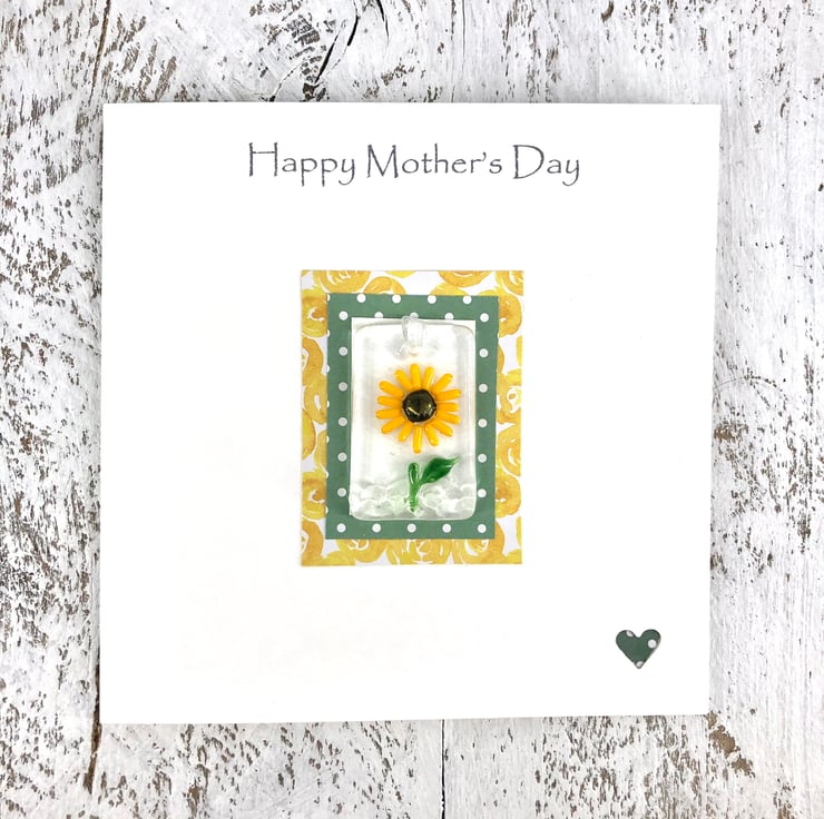 A lovely handmade card with a pretty fused glass hanging with a gorgeous sunflower on attached to it - the perfect card and gift in one!