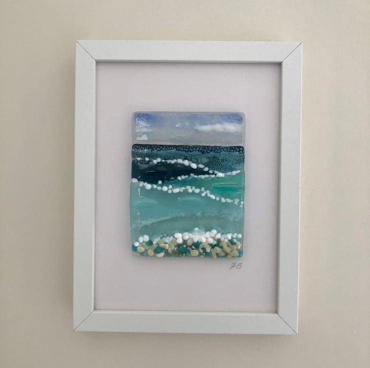 Stunning and completely original fused glass seascape picture, created with a beautiful selection of glass, including iridescent glass, glass powder and enamels that capture the light and depth of the ocean. Handmade in my studio in Dorset, inspired by views from my local beach.