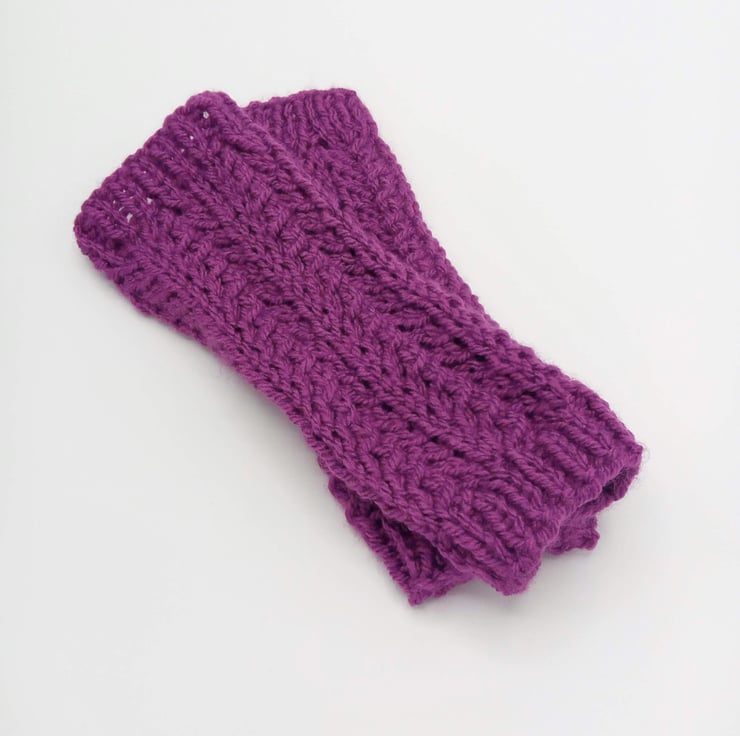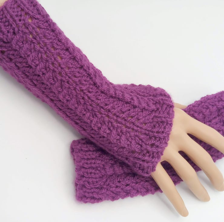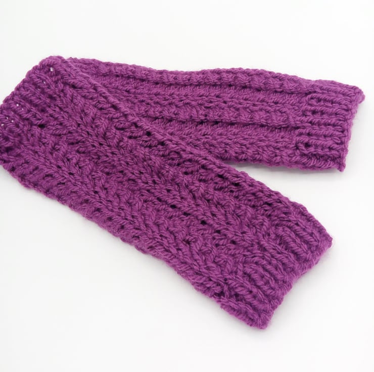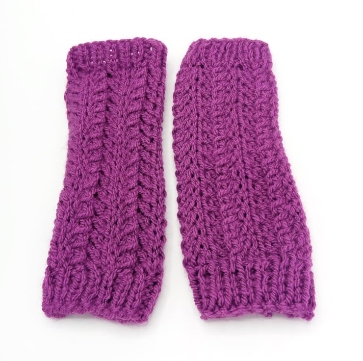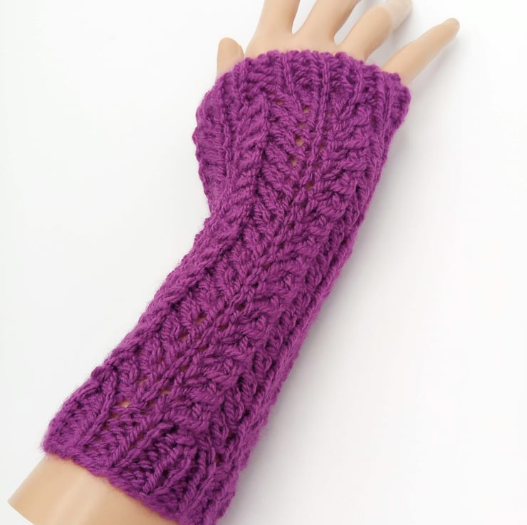 These purple lacy fingerless mittens are hand knitted in aran weight yarn. This pair is to fit a child approximately 4 - 6 years old but they can be made in any of the sizes shown below and in a colour of your choice. Please state colour when your order and allow 1 - 2 weeks for your mittens to be made and posted out to you.