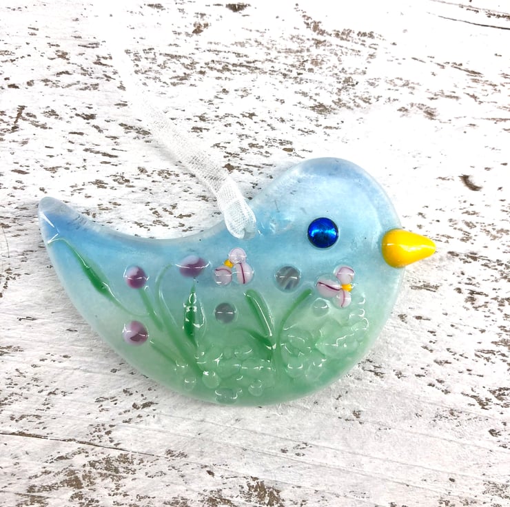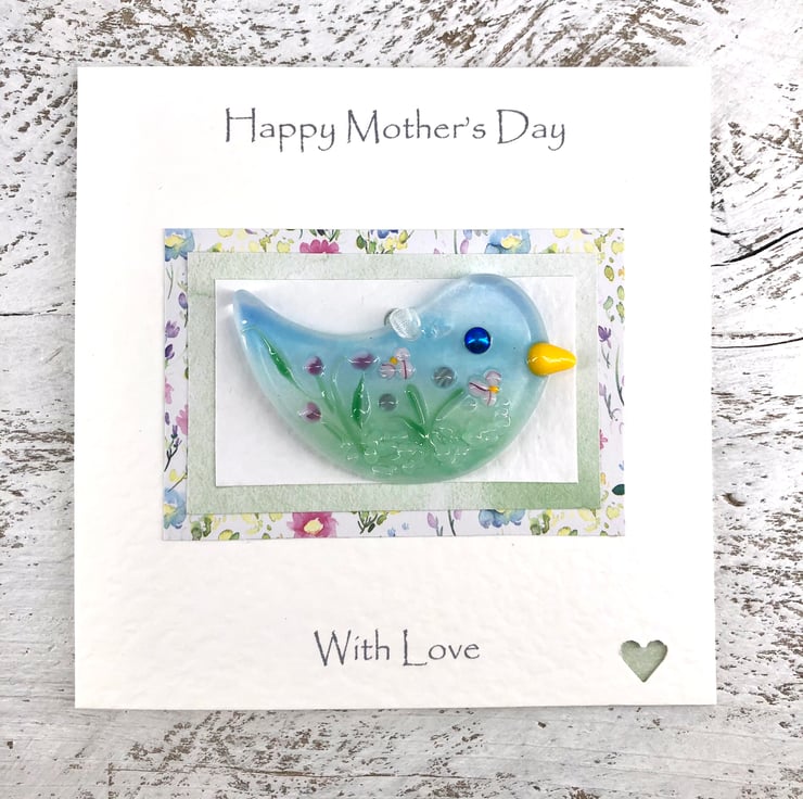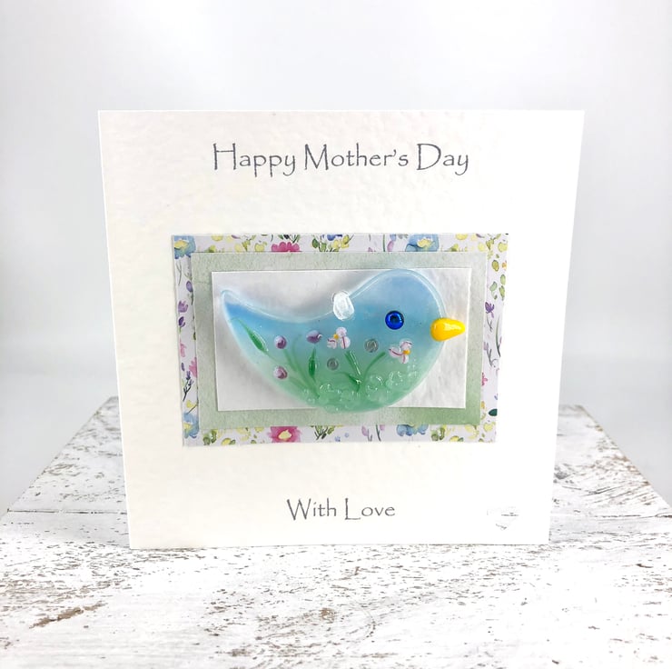 A lovely handmade card with a gorgeous fused glass bird with wild flowers attached to it - the perfect card and gift in one!