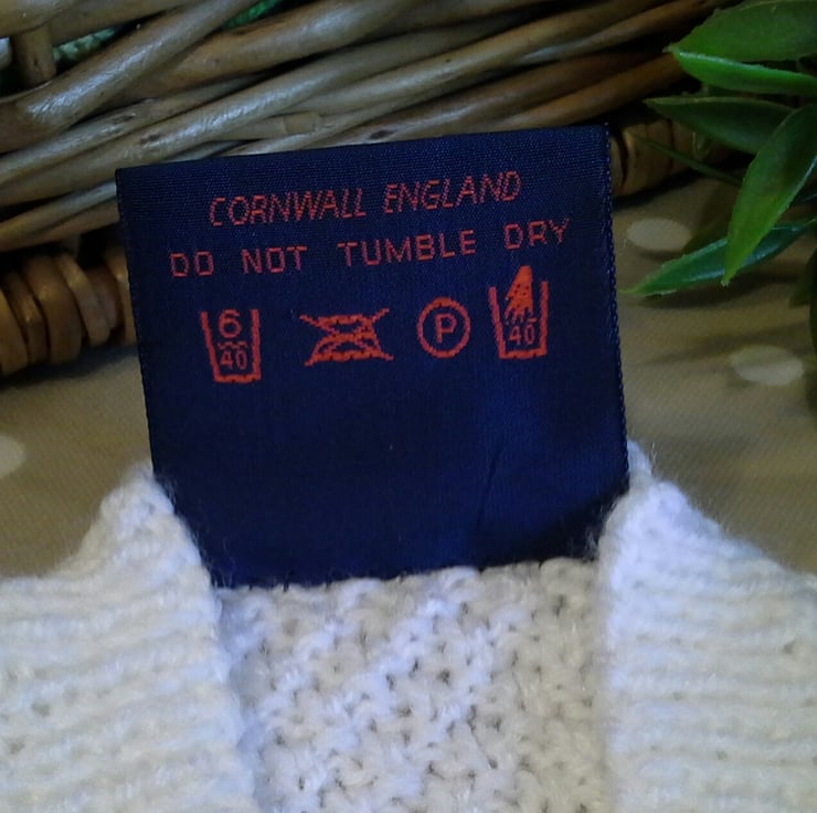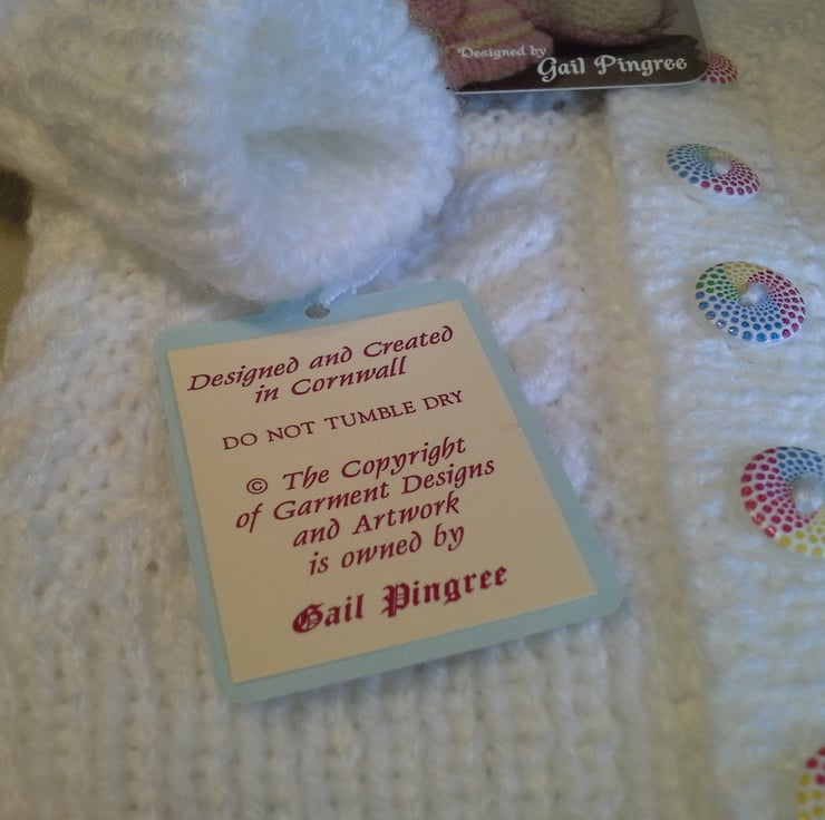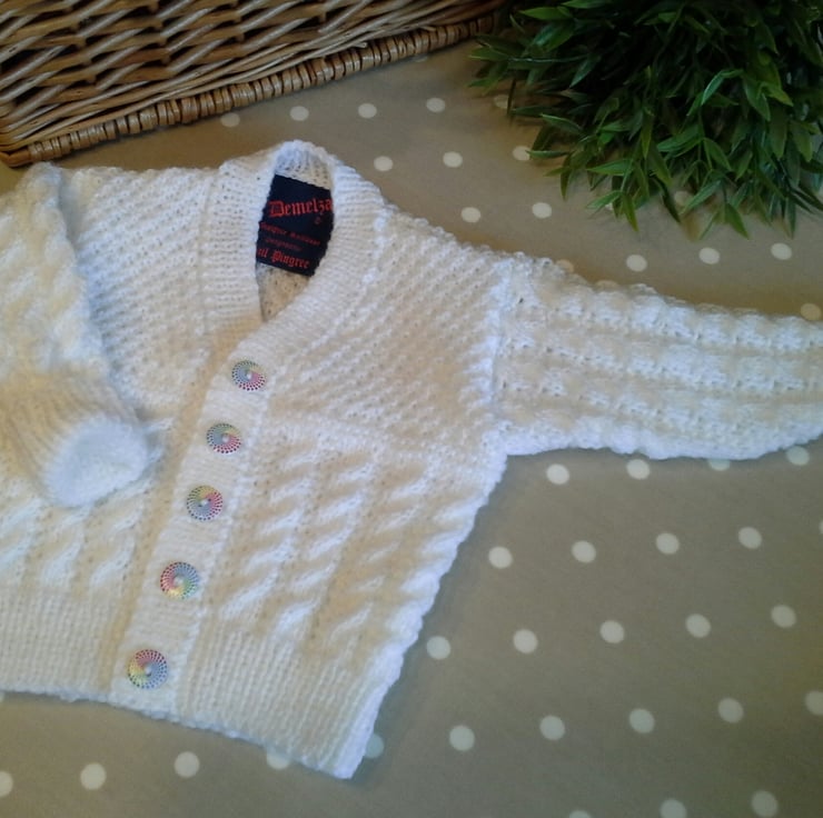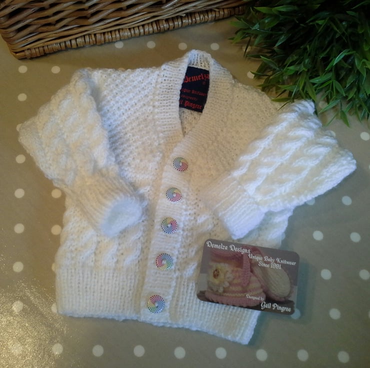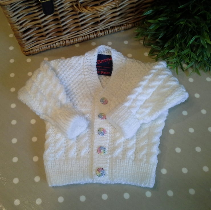 A lovely practical white everyday cable design cardigan for either sex young baby. The buttons are made from genuine wood with a delicate rainbow cartwheel design on them. The yarn is a premium grade acrylic and machine washable at low temperature settings. The item has the Demelza Designs garment label attached to the back neck edge as proof of it's origin if gifting with the care instructions woven on the reverse side as shown for quick referral for buzzy mothers/carers.