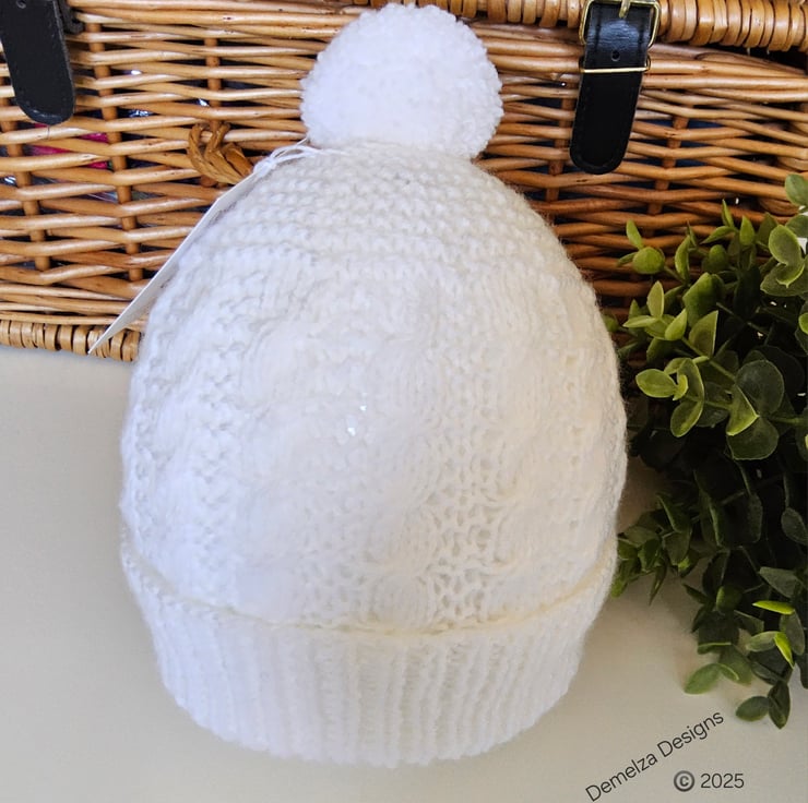 It has been hand knitted using a cable technique using premium soft acrylic yarn machine washable yarn. On the top is a large 8cm pom pom.