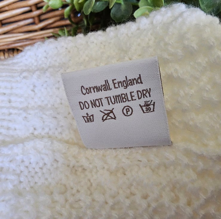 Baby knitwear is designed and hand crafted by Demelza Designs in Cornwall meeting UK baby safety standards, Only branded premuim acylic, acrylic/natural fibre blends or pure natural fibre yarns are used in baby knitwear which conforms to BS984/76 standards.