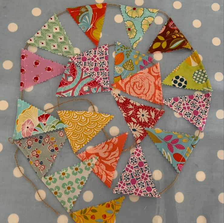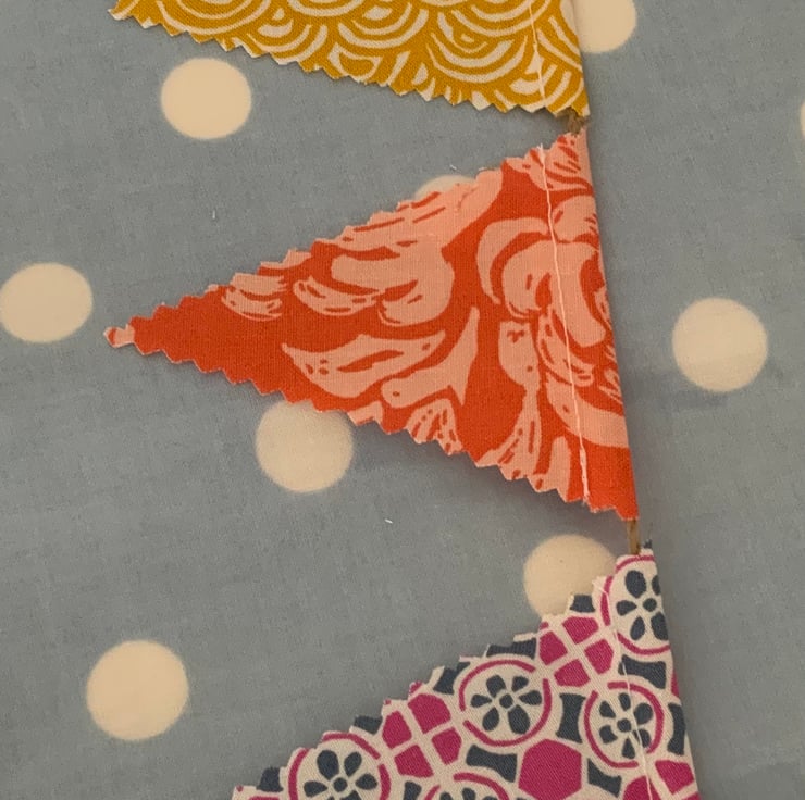 Gorgeous bunting roughly 4ft long, each little flag is 3” tall, single sided and made using cotton fabric then attached to Twine , you can slide the little flags along the Twine if you prefer the hearts closer together or further apart
