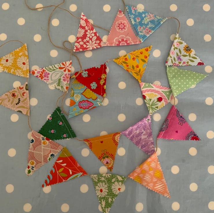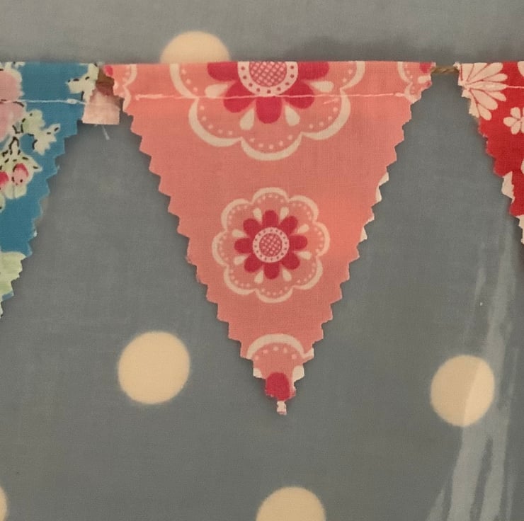 Gorgeous bunting roughly 4ft long, each little flag is 3” tall, single sided and made using cotton fabric then attached to Twine , you can slide the little flags along the Twine if you prefer the hearts closer together or further apart