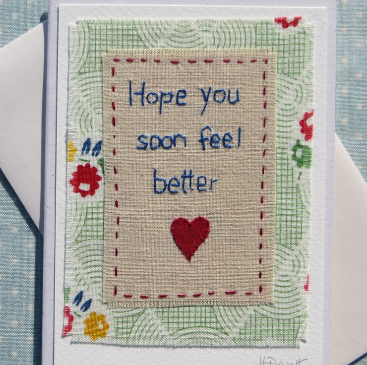 For this card I have embroidered the words 'Hope you soon feel better' adding a little applique heart. I then stitched the embroidered panel to a lovely piece of pretty cotton print fabric for the background. This fabric is a copy of one from 1940s so it has lots of old world charm! A special way to show you are thinking of someone going through a difficult patch and sending them your love.