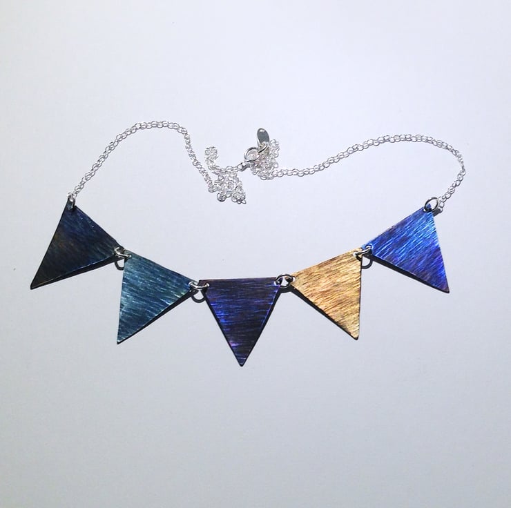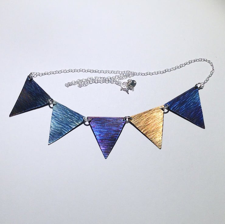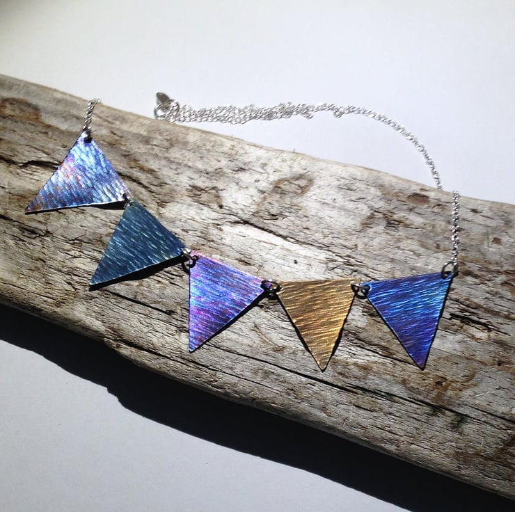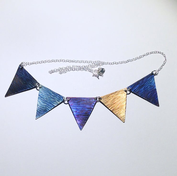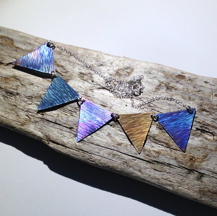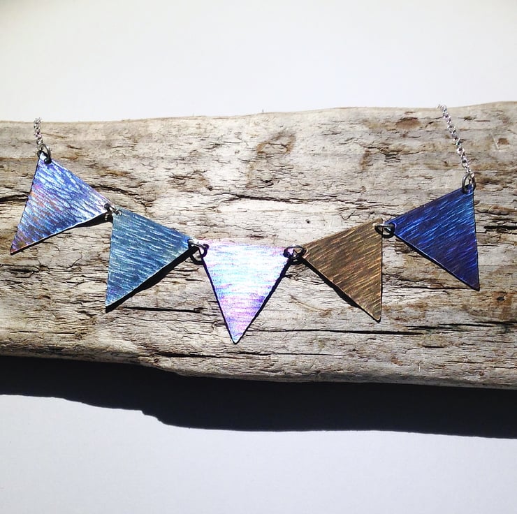 I have made this necklace by hand sawing the shapes from titanium sheet and have given the surface an attractive hammered finish before heat colouring. I have then joined them together with sterling silver jump rings and attached sterling silver chain to create the necklace.