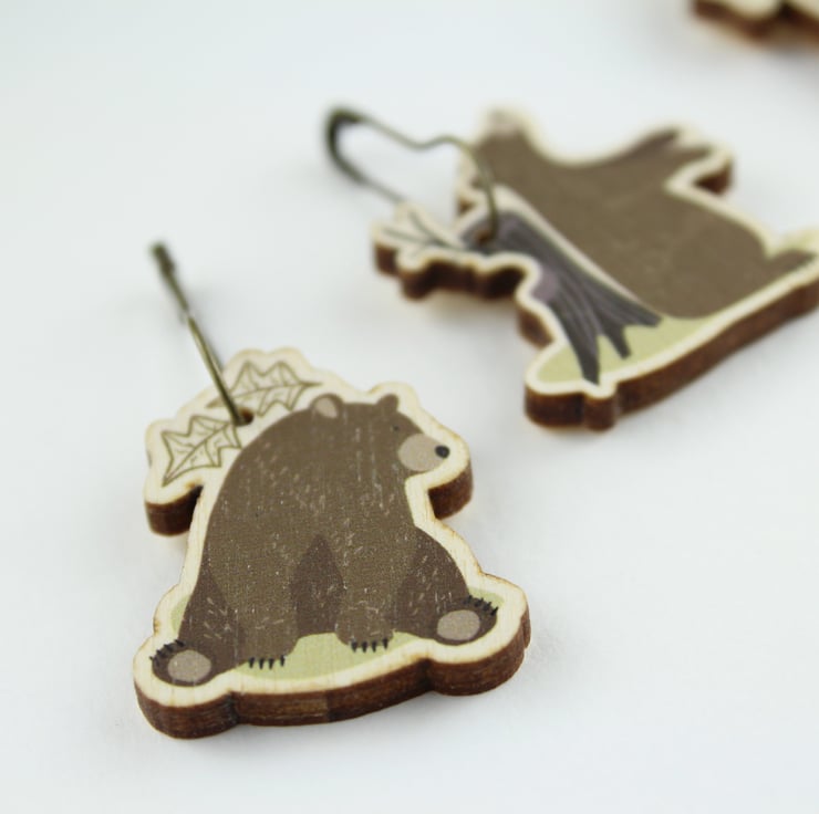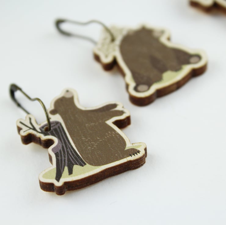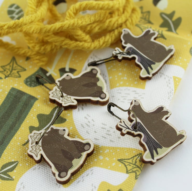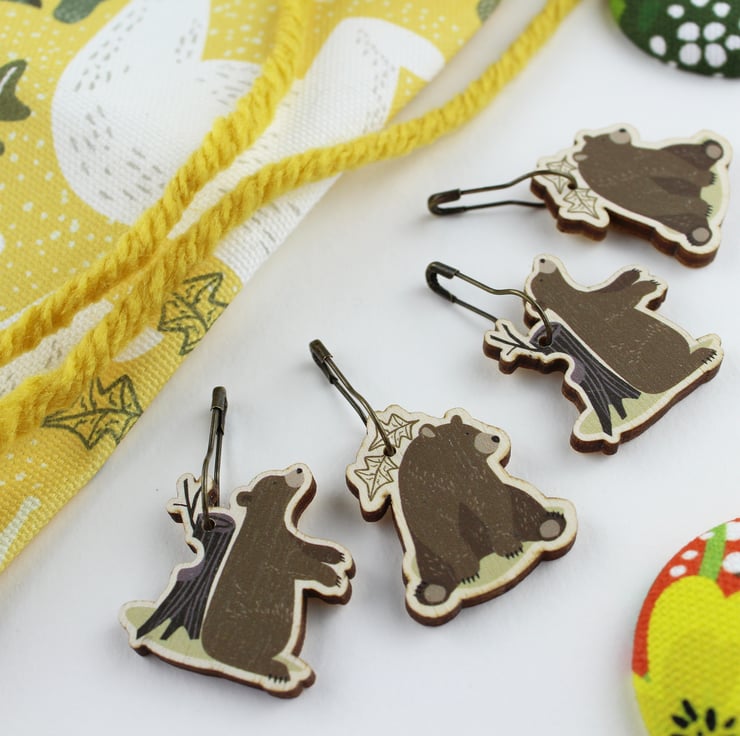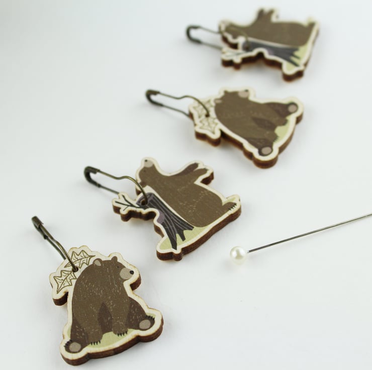 Pack of 4 wood crafted stitch markers (progress keepers), two bears sitting and two bears scratching on a tree, in a keepsake tin.