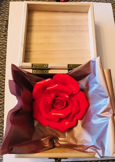Metal hook on the back for easy hanging, The Hand painted Rose comes in a wood Box 12cm by 12cm and will be wrapped in tissue.