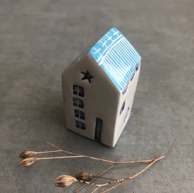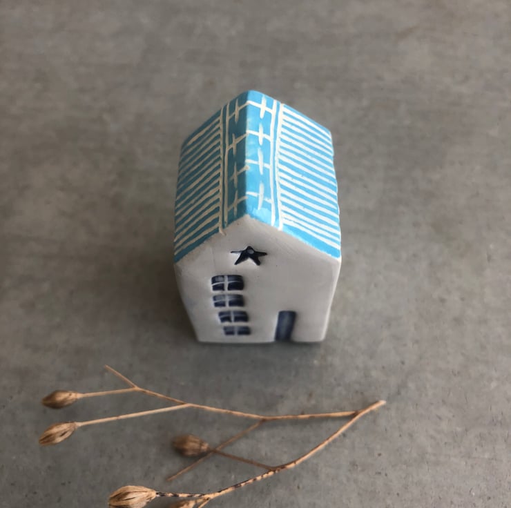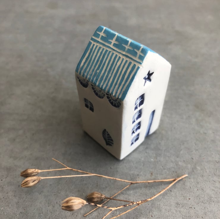 This house is hand built from white earthenware clay, decorated with coloured slip and finished with a hand drawn design using the scraffito technique. Impressed designs have also been added using my own handmade stamps decorated with underglaze .