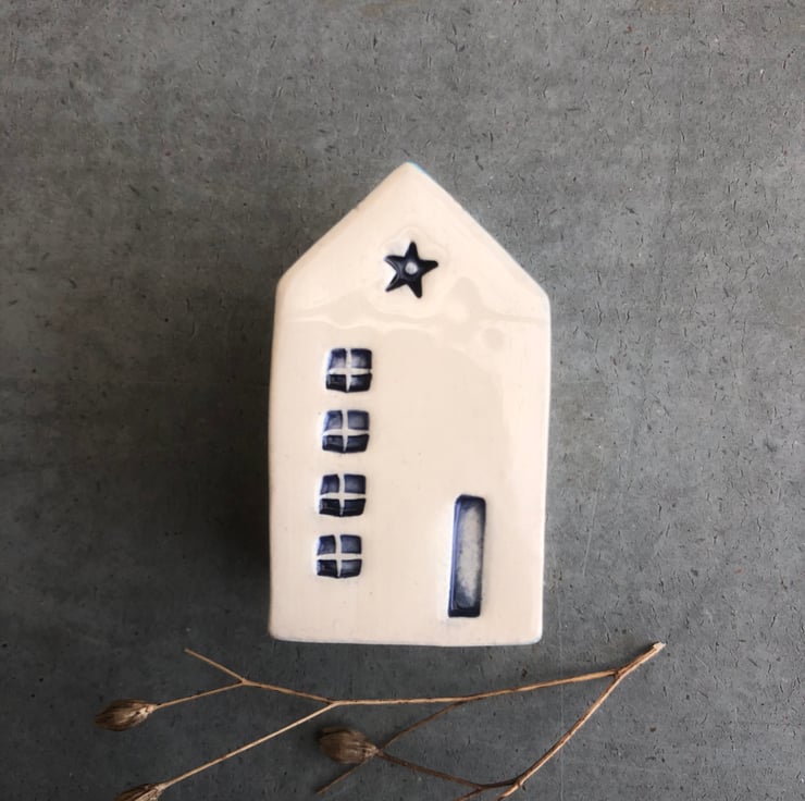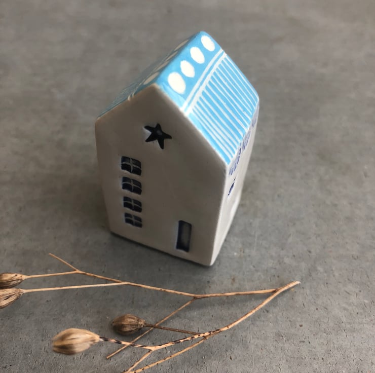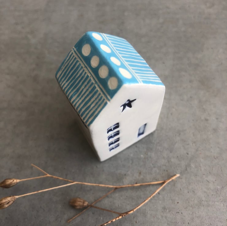 This house is hand built from white earthenware clay, decorated with coloured slip and finished with a hand drawn design using the scraffito technique. Impressed designs have also been added using my own handmade stamps decorated with underglaze .