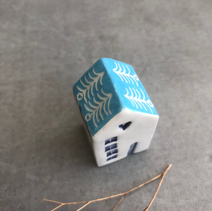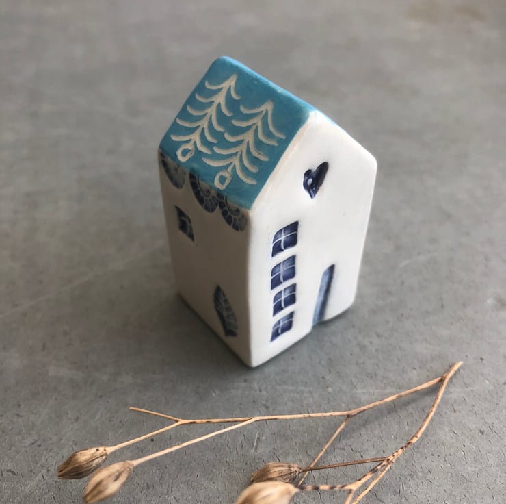 This house is hand built from white earthenware clay, decorated with coloured slip and finished with a hand drawn design using the scraffito technique. Impressed designs have also been added using my own handmade stamps decorated with underglaze .