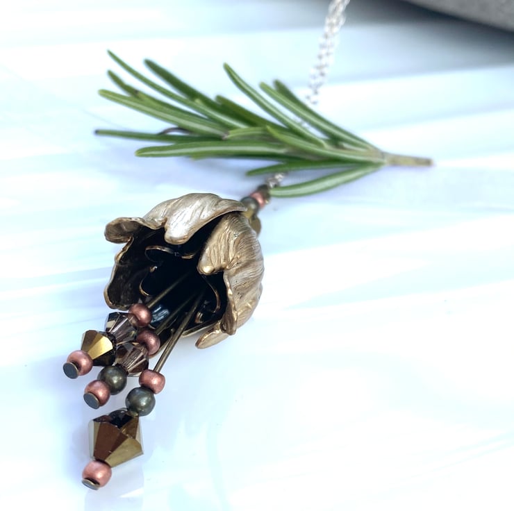 Bronze coloured Oxidised Tulip necklace with a pair of bronze crystal details.