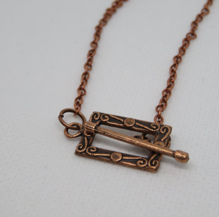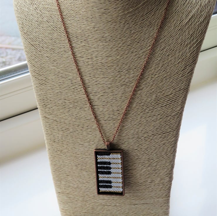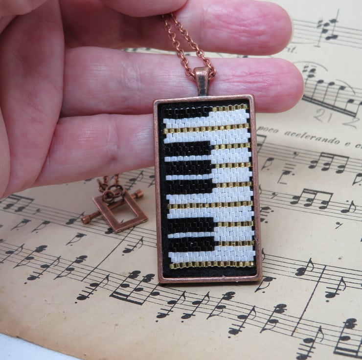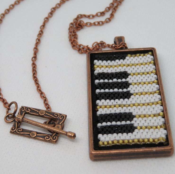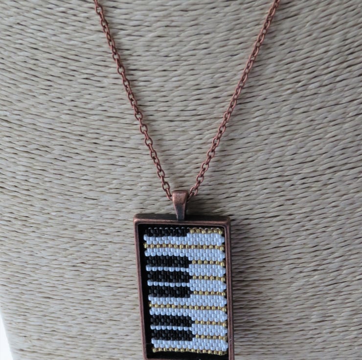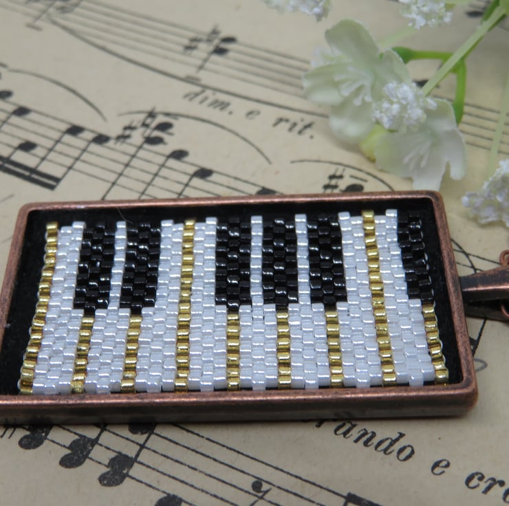 Strike a chord with this hand beaded piano pendant! The 'keys' cover a full octave starting at C and are worked in peyote stitch with Miyuki delica beads, then stitched and glued onto black bead backing and set in a copper bezel mount. This substantial pendant has a copper chain with decorative rectangular toggle clasp.