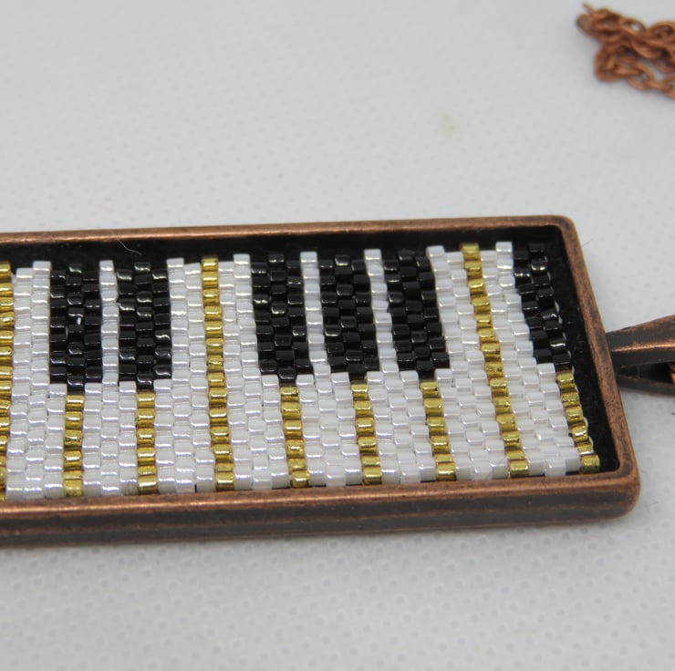 As a not particularly good pianist myself, this idea sprang to mind one day - a hand beaded keyboard you can carry around with you. It doesn't actually play music of course, but is just a fun piece of jewellery that can be worn by anyone. The classic black and white keys with gold accents for the 'gaps' contrast nicely with the copper mount.