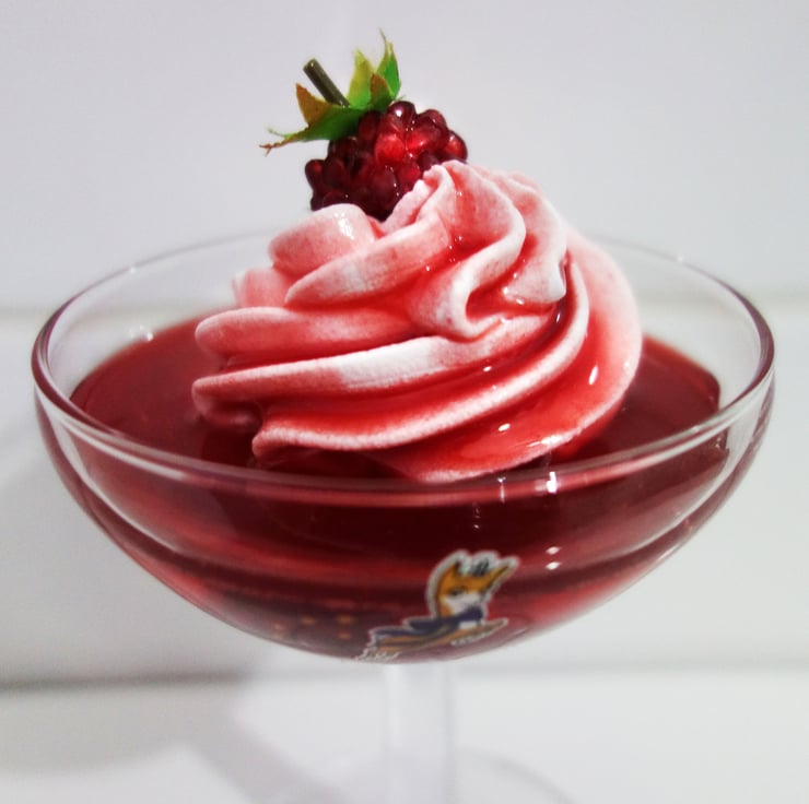 This faux dessert is a deep clear red in the jelly and a rich creamy white for the whipped cream. It really is a beautiful and very realistic display piece.