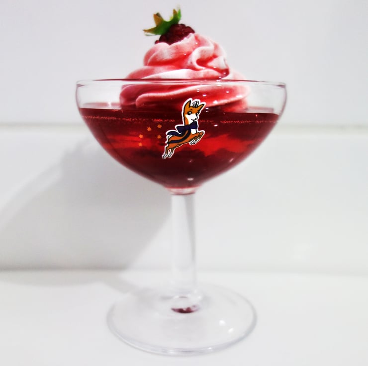 Framboise jelly dessert topped with fake whipped cream, raspberries and drizzled with fake raspberry sauce.