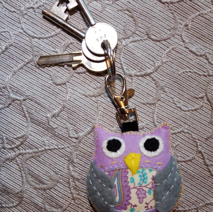 Lilac felt little owl stuffy bag charm wearing grey wings and cotton paisley fabric tummy.
