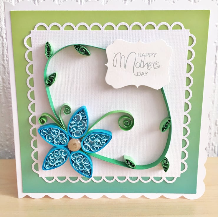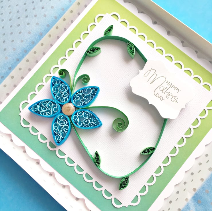 This card features a large quilled blue flower with an epoxy centre. The white scalloped mat sits on a green-blue ombré background and the card says Happy Mother’s Day in silver foiled lettering on the top right of the card. Inside the card is blank for you to write your own greeting.