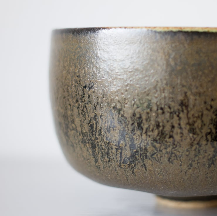 The main body is glazed in a brown glaze which has created interesting black/dark brown patterns as it flows during the firing. On the underside there are some gentle undulations where the glaze has started to form drips.