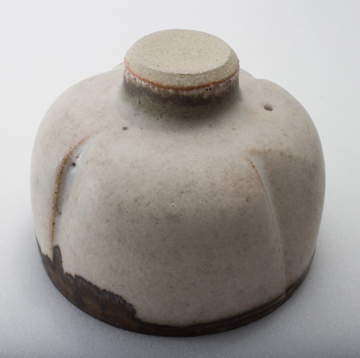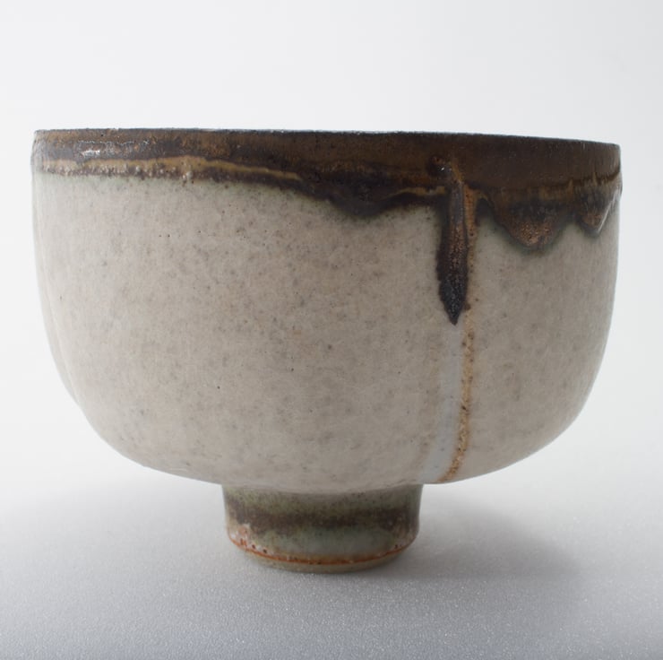 Thrown in one piece on the wheel these vessels start life upside down where two walls are pulled up and joined together leaving an empty void in between similar to how a thermos flask looks. This is then manipulated to create the form shown. Further trimming refines the shape. It is then bisque fired, glazed and then fired up to 1260'C.