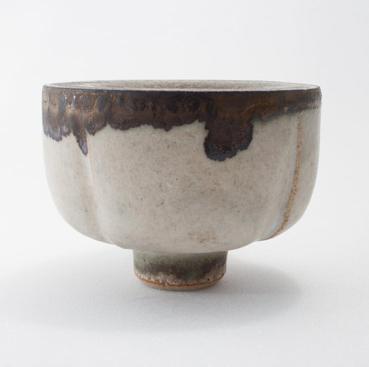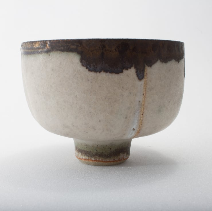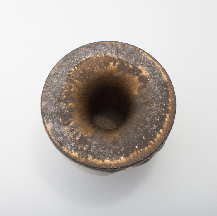 Glazed on top with black gold colour which leaves a gold flecked surface like it's been dusted with gold leaf. The main body is glazed in an off white. Where the vessel has been scored the black gold glaze has started to run down creating additional interest.