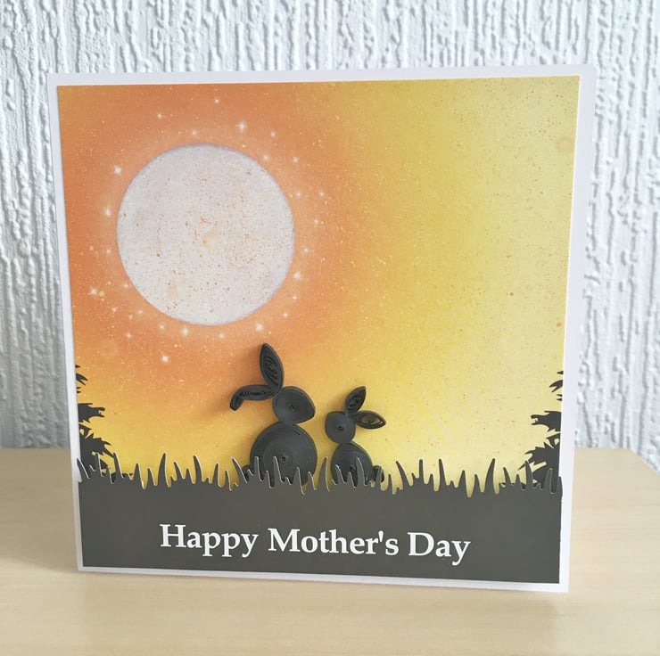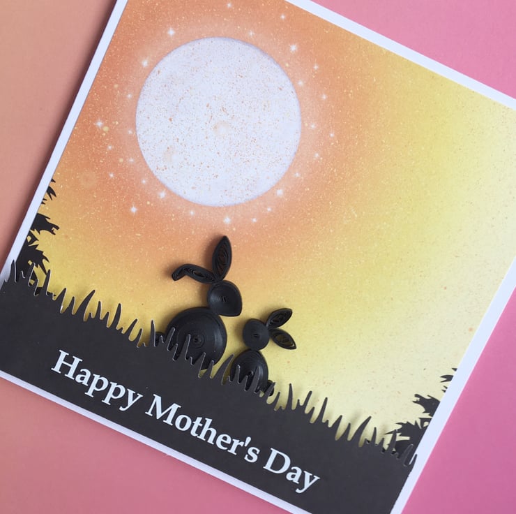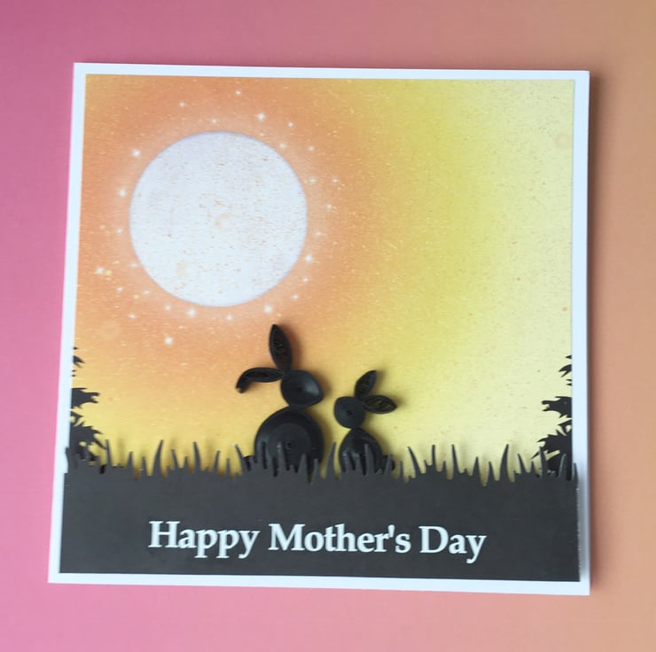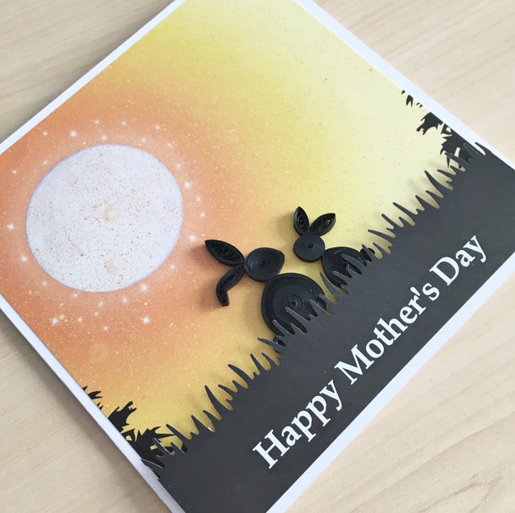 This card features a quilled mother rabbit with her rabbit-child who is gazing up at her during a beautiful sunset. After all, a mum is a beautiful sight to a child.
