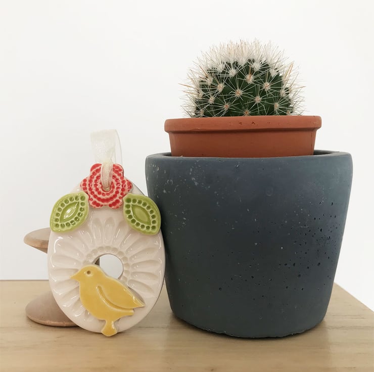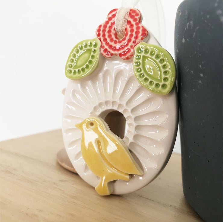 This little ceramic easter egg is made from white earthenware clay and imprinted with pattern. It is topped with a swirly flower and two leaves and a little Easter chick. This has been fired in an electric pottery kiln, so it is nice and strong. It measures 6.5cm x 4.5cm and hangs from a matching cream organza ribbon. It is glazed on the front and left plain on the back.