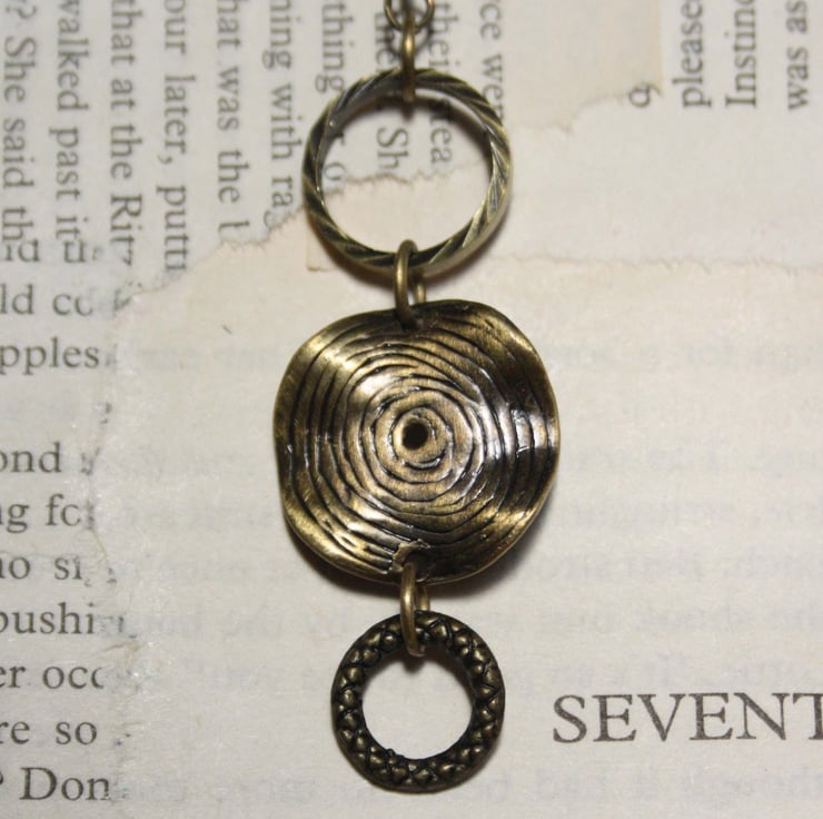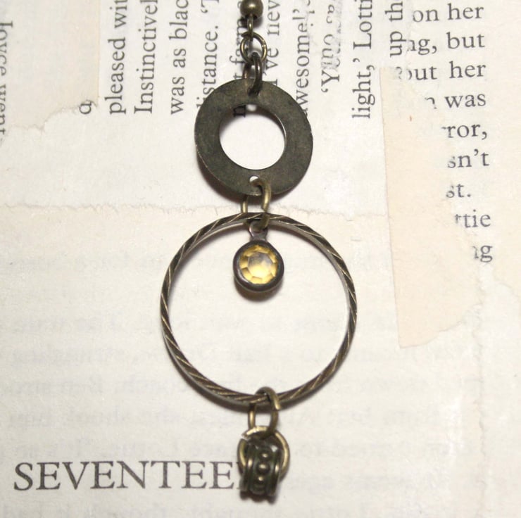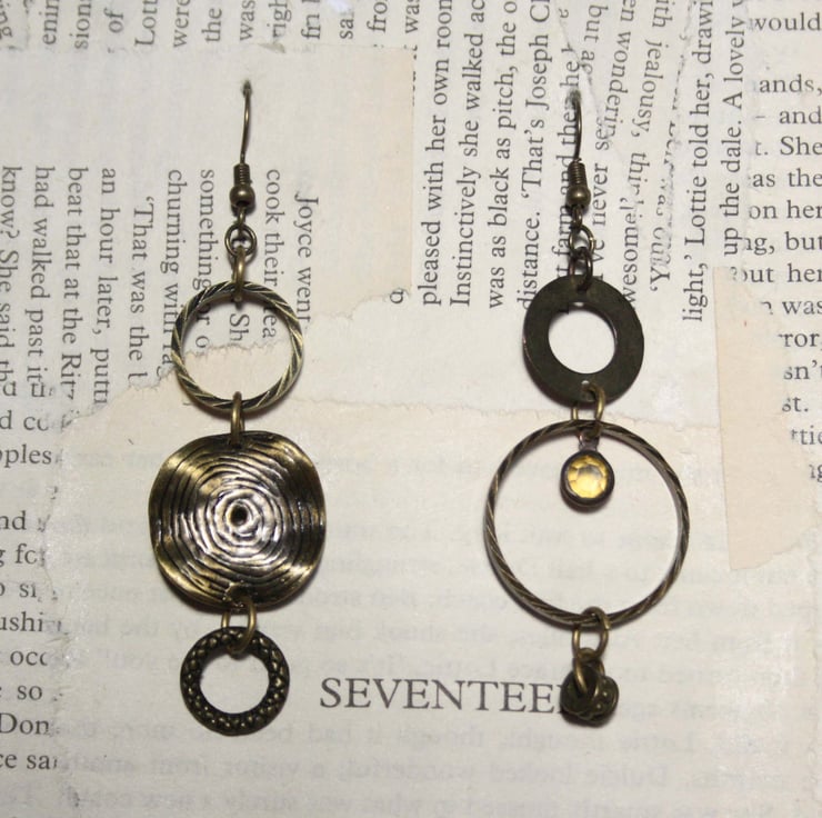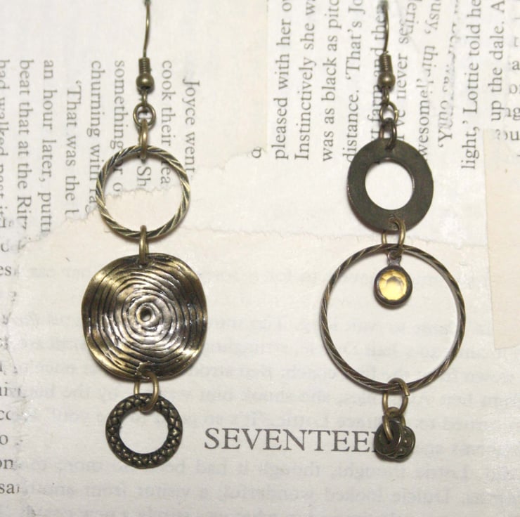 This pair of mismatched boho inspired earrings feature a variety of circular metal findings. Wear them together or wear apart.
