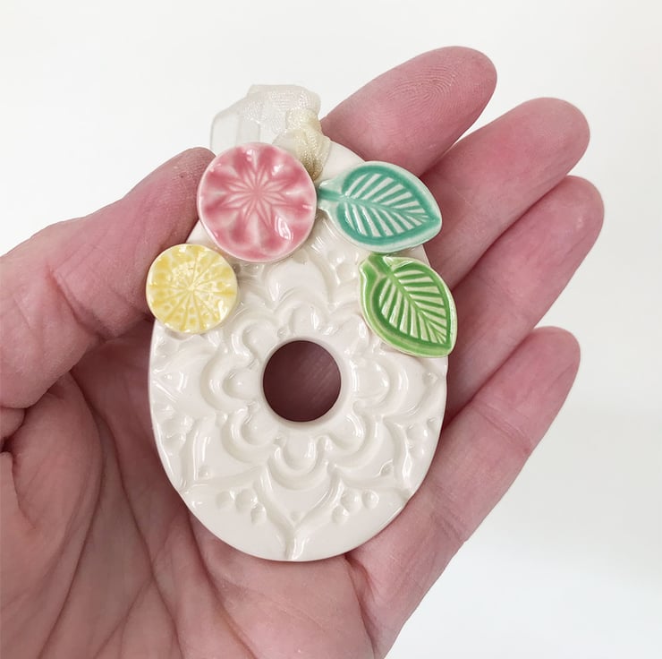 This little ceramic easter egg is made from white earthenware clay and imprinted with pattern. It is topped with a couple of flowers and two leaves. This has been fired in an electric pottery kiln, so it is nice and strong. It measures 6.5cm x 4.5cm and hangs from a matching cream organza ribbon. It is glazed on the front and left plain on the back.