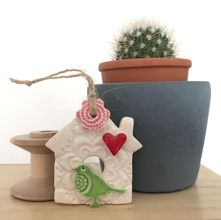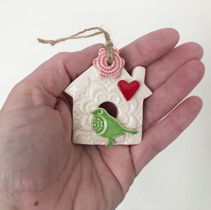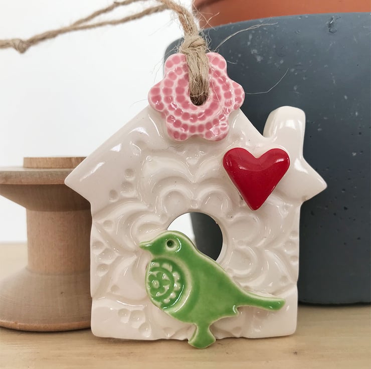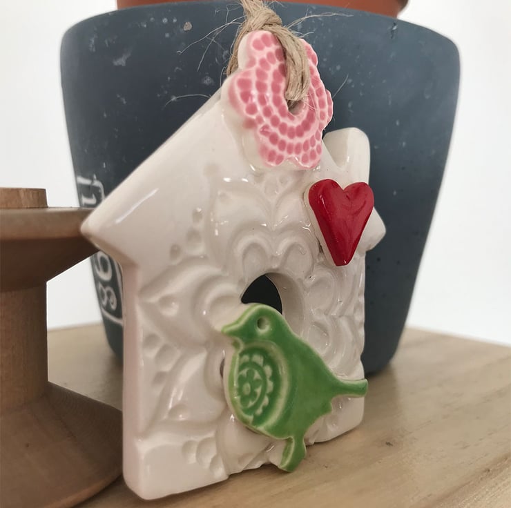This little bird house decoration is made from white earthenware clay and finshed with a little flower and a bright bird. It has been fired twice and finished with a glossy glaze for a lovely smooth finish. It measures 7.5 x 7cm and hangs from rustic brown string