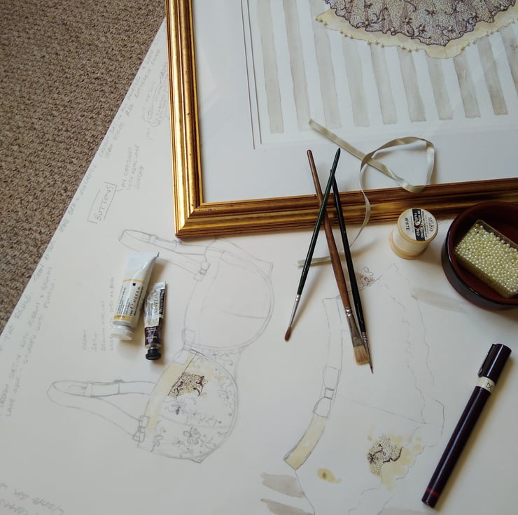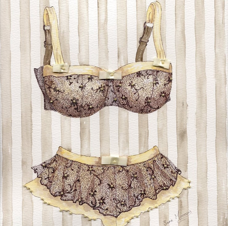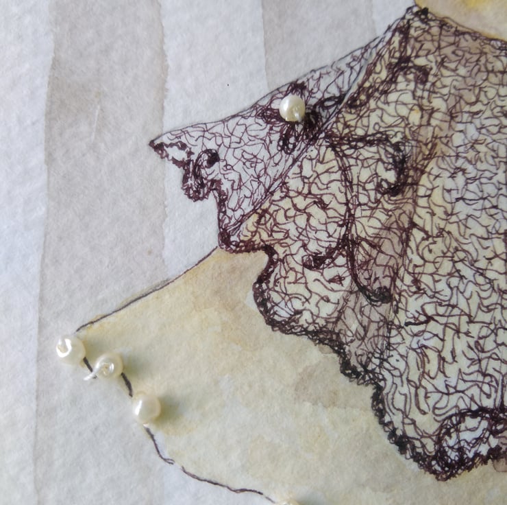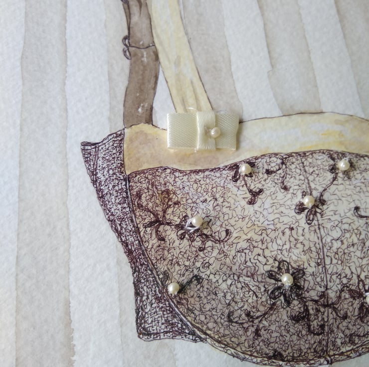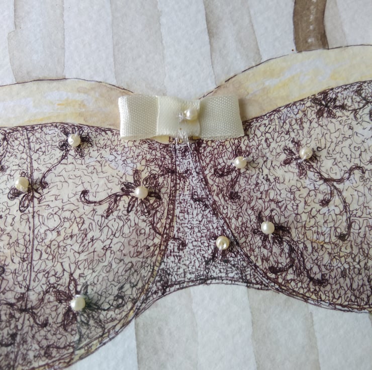 I wanted to create something intensley feminine in this 'Lingerie Collection'. It has given me the opportunity to combine my background in fashion and textiles with my love of painting. I think this is one of my favourite paintings in this collection, although I do love them all. I think the delicate ink-work and hand sewn seed pearls, which took ages to do, are so pretty and the bows are elegant too. Also the simple cream and sepia pallet is super versatile.