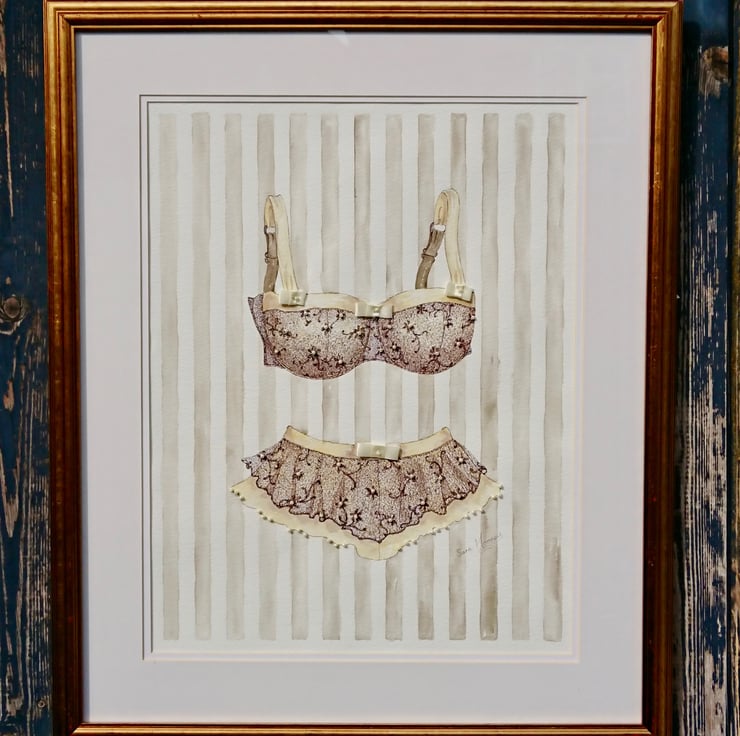 This is an original watercolour hand painting of bra and knickers featuring cream and sepia ink detail. Glamorous hand-stitched cream satin bows accent the bra top and waistband. Hand stitched seed pearls form the centre of each tiny flower and bow and edge the hem of the flirty double layered knickers. The background is a sepia stripe. Subtle, neutral colours will work with most color schemes. The art-work is from my sexy 'Lingerie Collection' created in my Norfolk studio. The painting is double mounted with a luxurious gilt frame which is ready to hang. The overall size is 61cm x 50cm. The internal image is 44cm x 33cm.