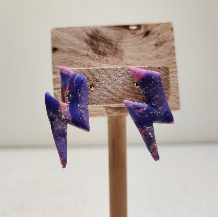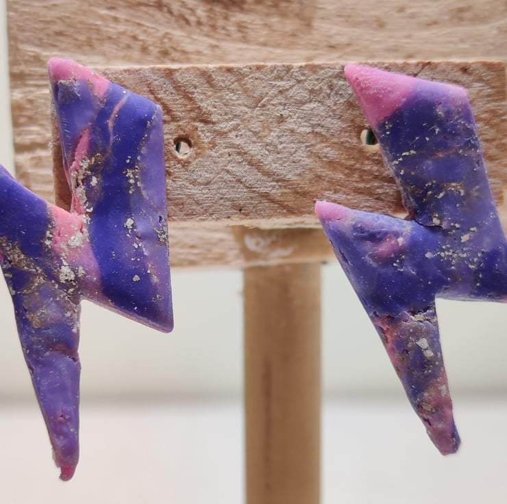 Hand made polymer clay earrings with an abstract pattern shaped as a lightening bolt. medium sized. Stud fixing which can be painted with hypo allergenic coating for free on request. Please see all photos for close up detail. All products handmade therefore there may be minor imperfections. Each pair sold as seen, message for more info