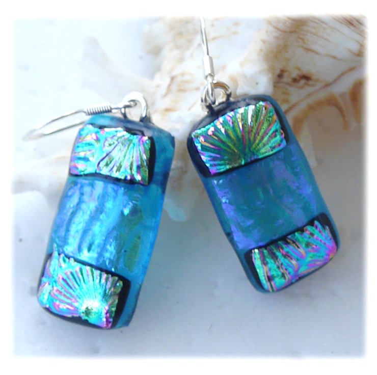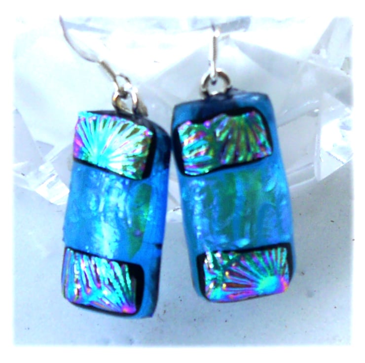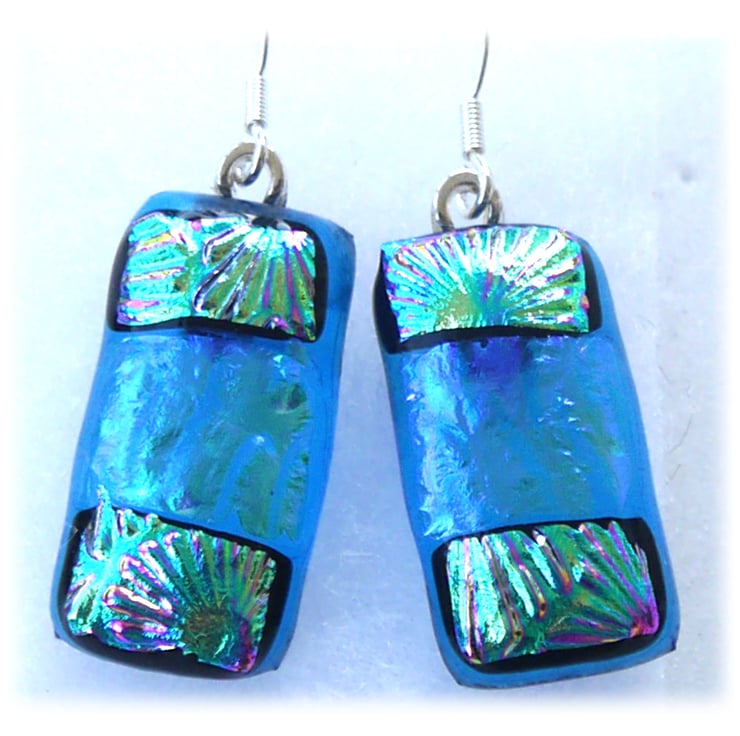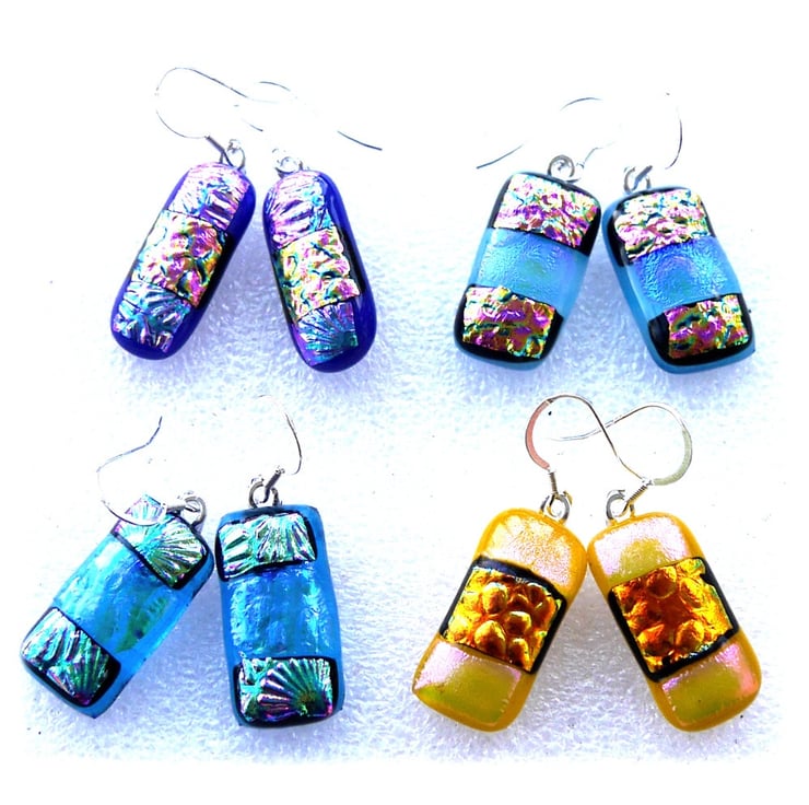 I've taken several photos of the earrings to try to show you the colour which changes in the light. this is a feature of wonderful dichroic glass. The last picture shows another 3 pairs made in the same batch and also available as separate listings. These are a longer design than I normally make.