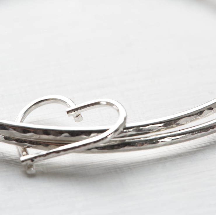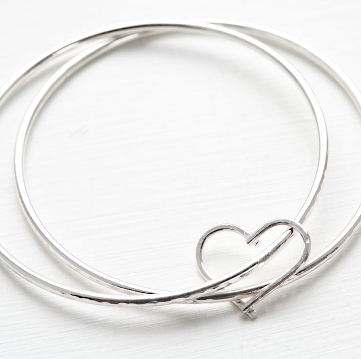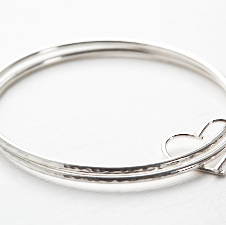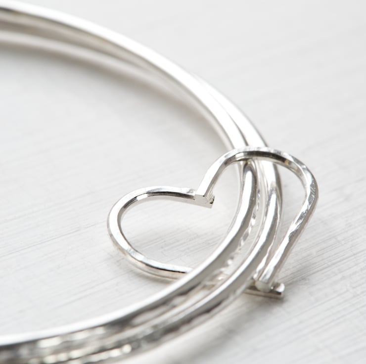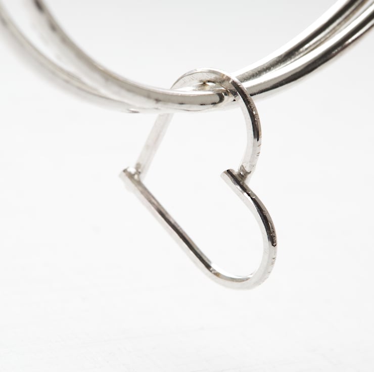 Handmade 925 Sterling Silver Double Bangle with Open Heart Link is made with 12 Gauge (2 mm) 925 Sterling Silver Wire and 16 Gauge (1.3mm) 925 Sterling Silver Wire for the Hear Link. The Bangles and Heart are hand forged and hand textured. The size of heart link is approximately 20mm x 18mm.