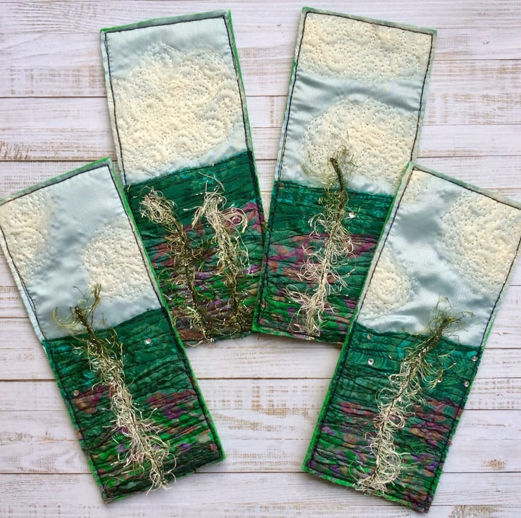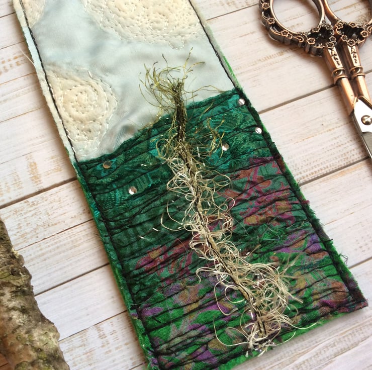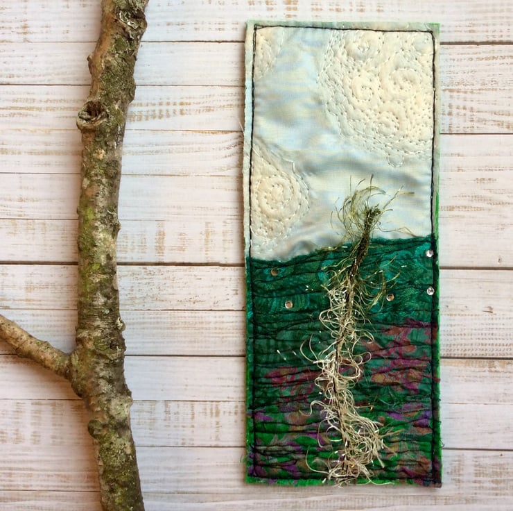 This embroidered landscape bookmark is made with layered up-cycled and recycled silk and enhanced with a wispy plant, merino wool clouds and free motion embroidery. The bookmark measures 7 x 16.5cm.