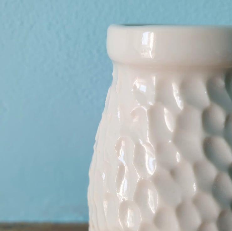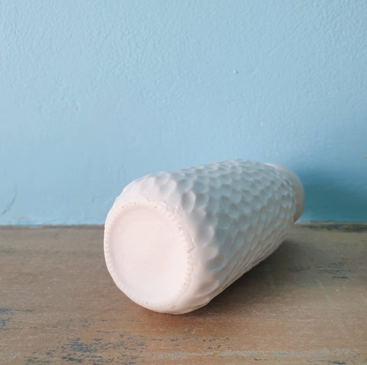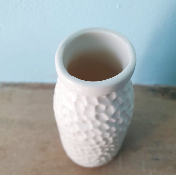 The porcelain is carved and left unglazed on the outside, giving it a cool, satin feel. All the vases are glazed on the inside to make them easier to keep clean. The image here is purely a representation: I make each vase to order so yours will look very similar but not exactly the same.
