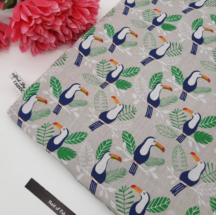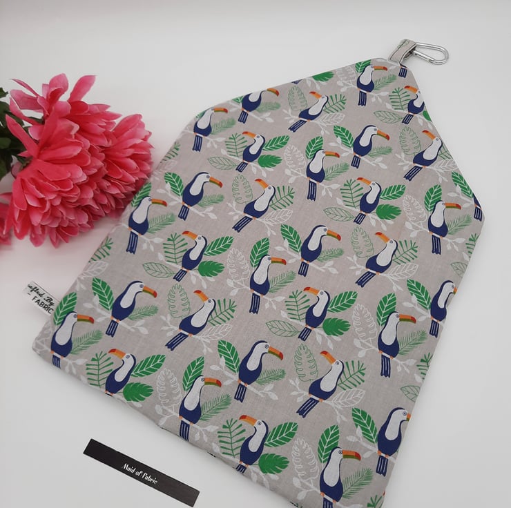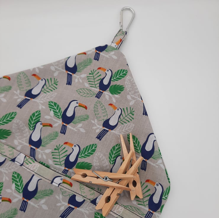 Peg bag made using a light grey toucan cotton fabric, lined with a navy blue cotton.