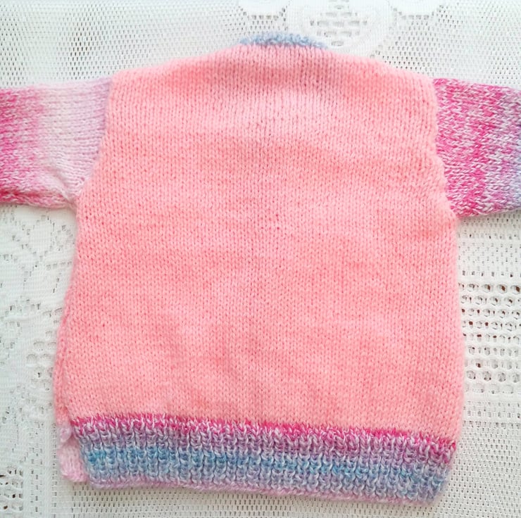 A pretty hand knitted round neck cardigan in shades of pink double knitting yarn. It is not currently in stock but it can be made for you in a size and colour of your choice. Please see below for the available sizes and prices and state the colour required when you order. Please allow approximately 2 weeks processing time for the cardigan to be made and posted to you.