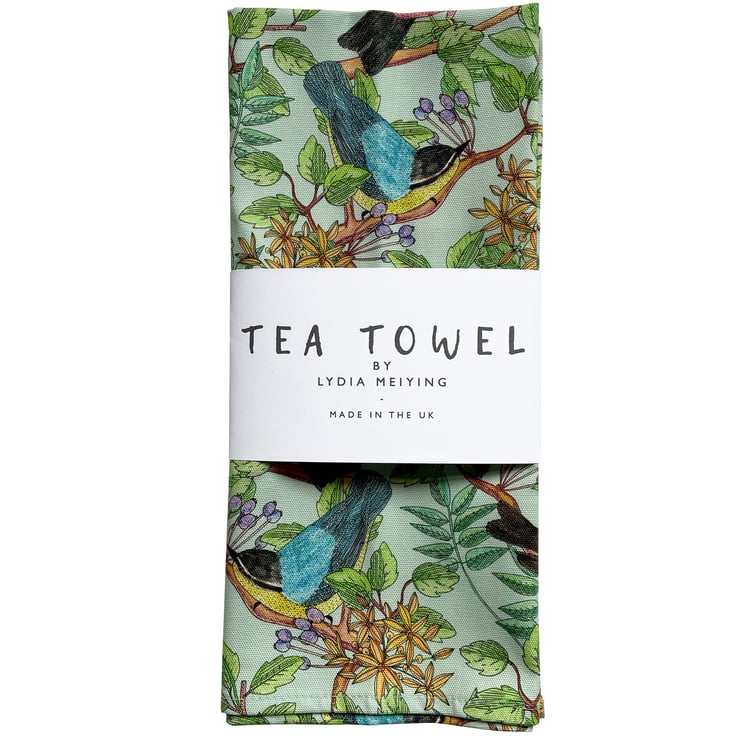 A tea towel featuring a pattern of birds, a perfect addition to any kitchen.