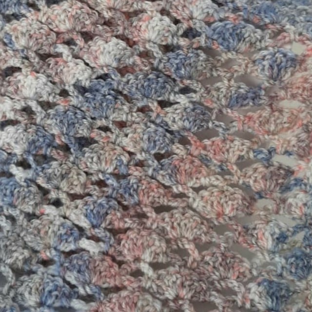 The lovely Pink and Blue in this yarn were irresistible. I found a beautiful shell connecting pattern that gave an amazing openwork finish to the scarf.