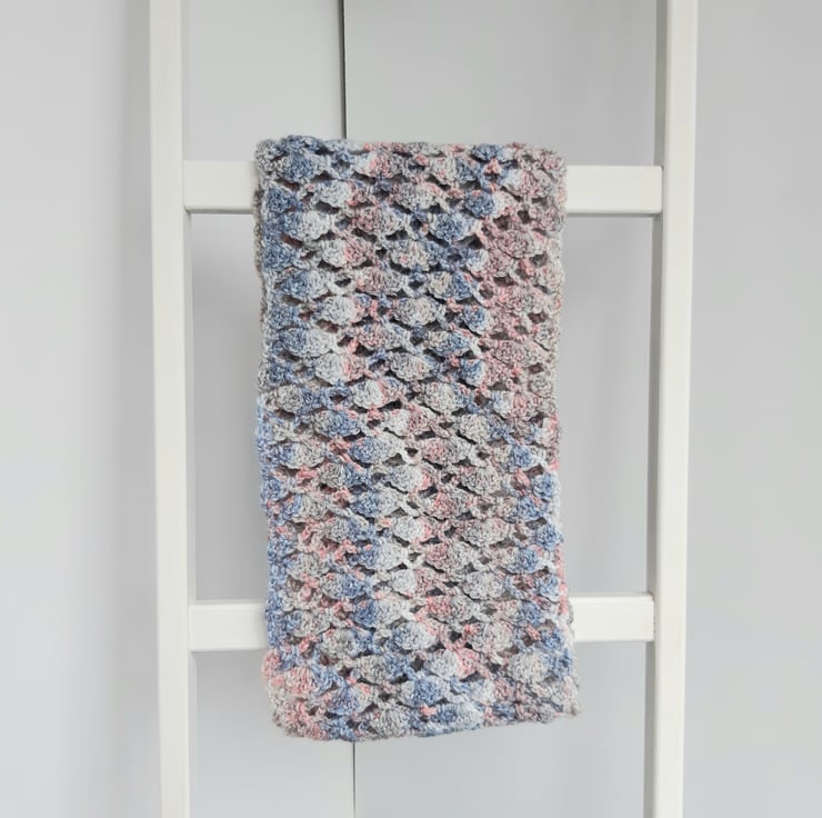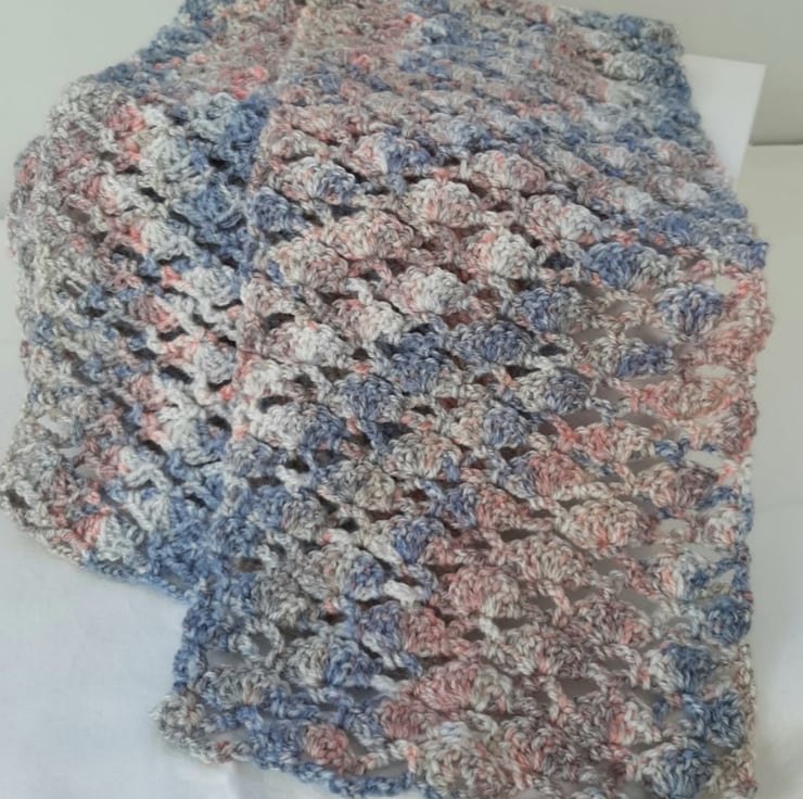 This scarf is made in a lightweight, openwork design, ideal for cooler days in Spring or Autumn. It is made in a shell connecting pattern and has a slight drape.