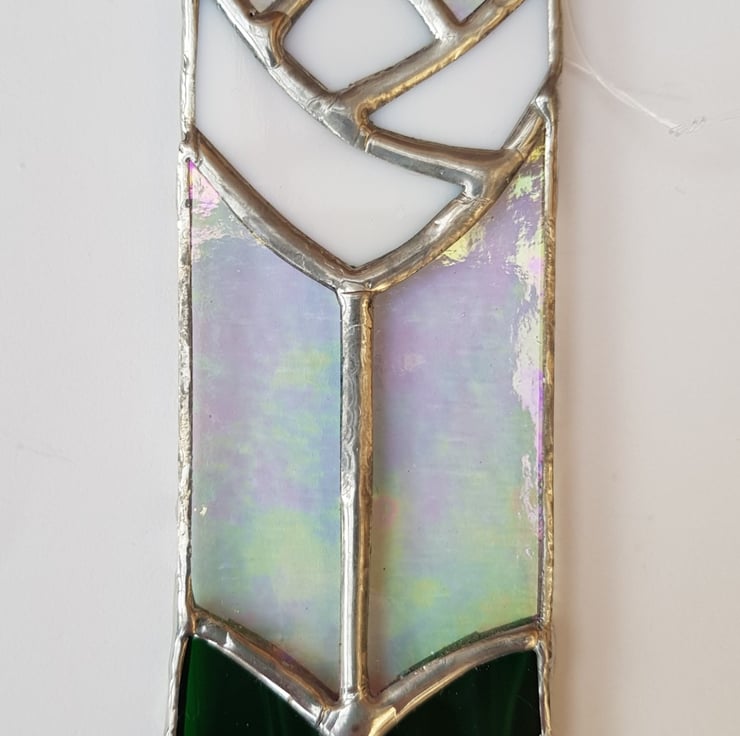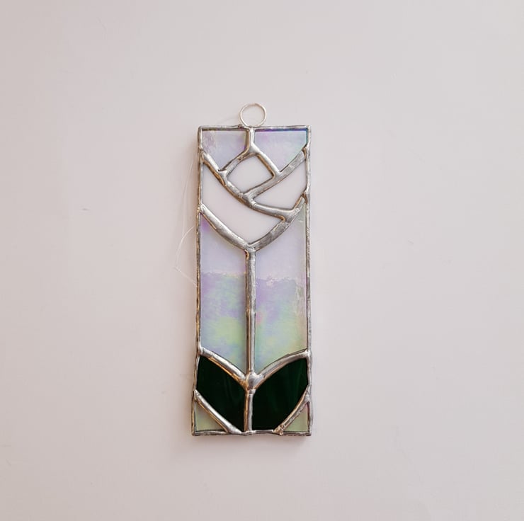 The tulip is made using white, green and clear iridised glass. For hanging it has a ring and invisible thread.