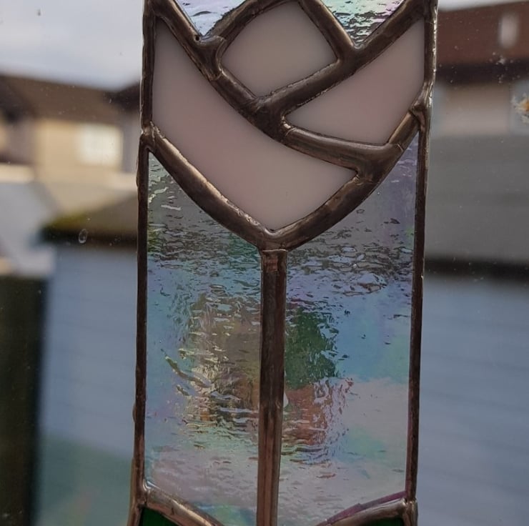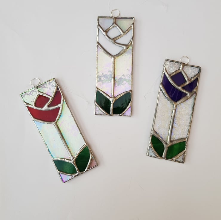 The Netherlands produce 3 billion tulip bulbs every year. My stylised tulip is handmade using the copper foil technique. The last picture shows other tulips some are listed separately.