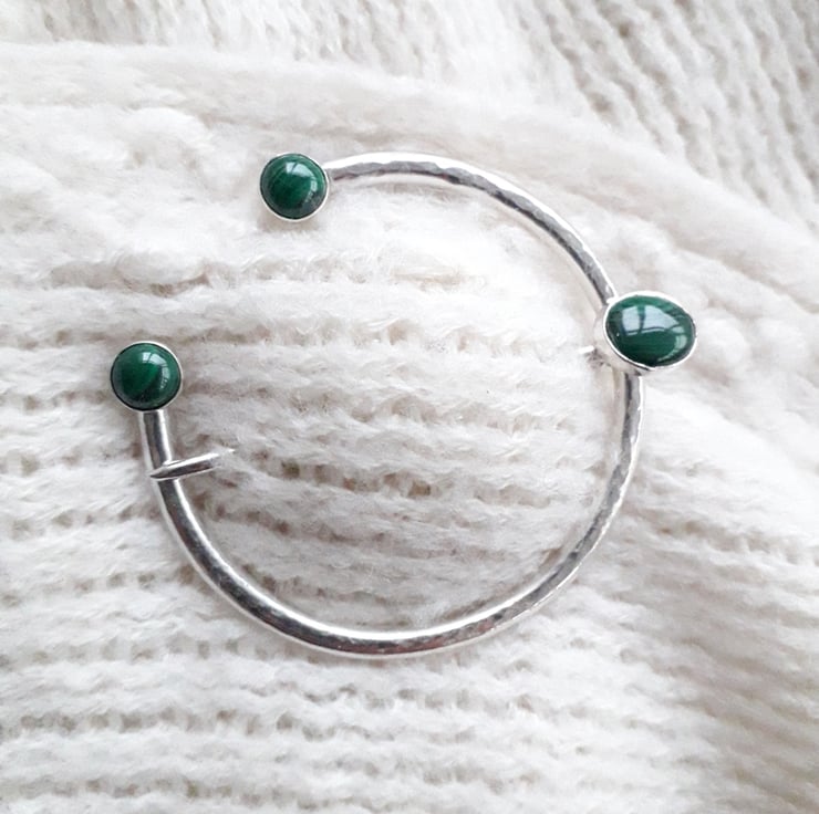 At the opening there are 2 x 6 mm Malachite Gems, 1 at each side, that are set into sterling silver settings, on the pin head there is 1 x 10 mm x 8 mm Malachite Gem set in a sterling silver setting.
