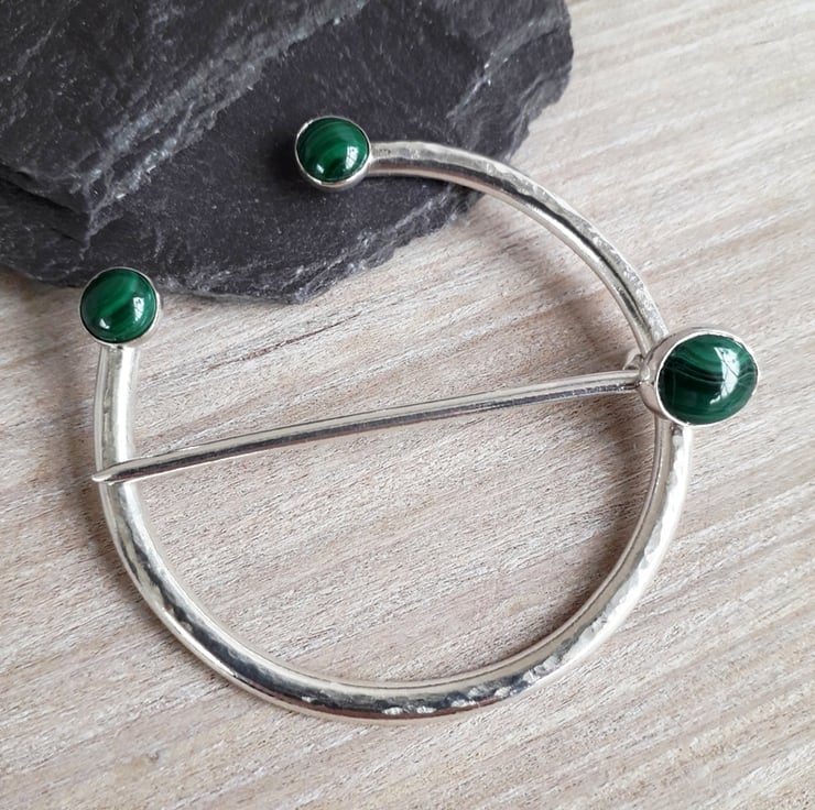 Sterling Silver Pennanular Malachite Shawl Brooch