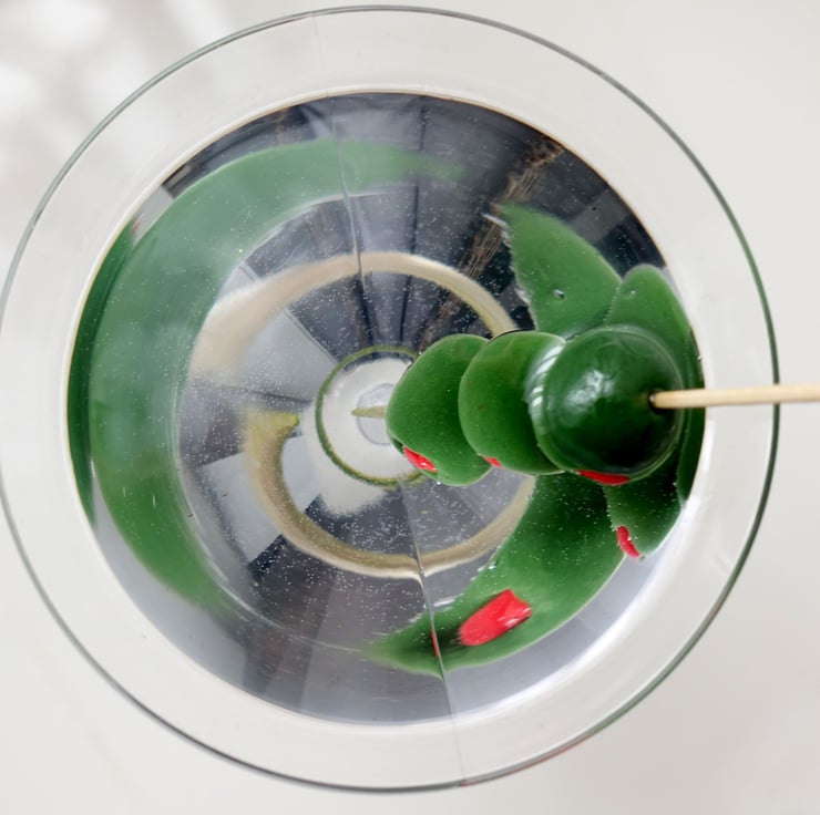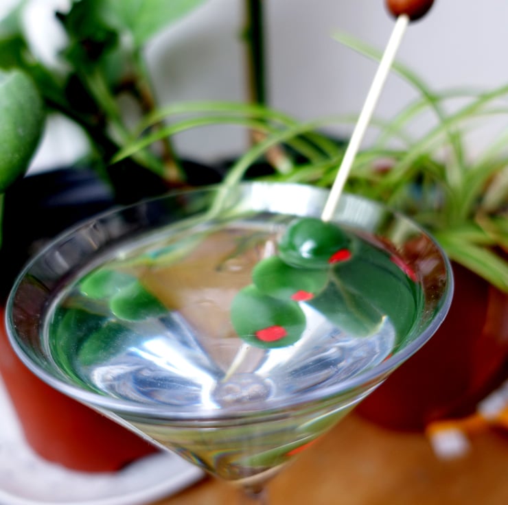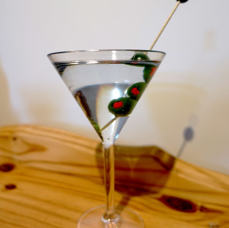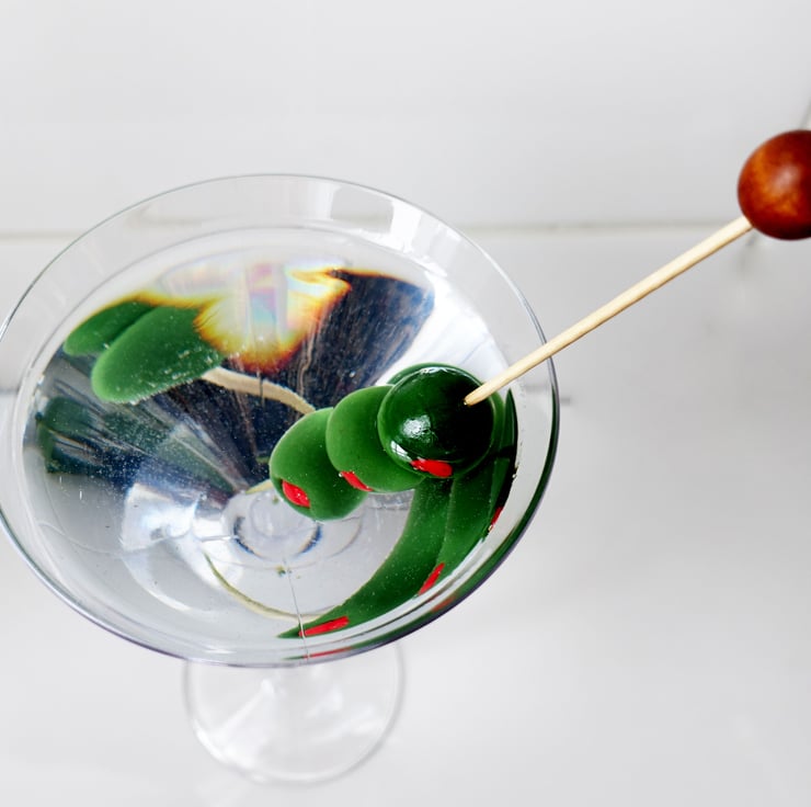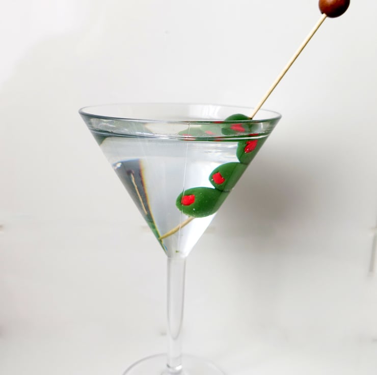 Highly realistic Martini cocktail in lightweight tough polycarbonate glass. Made from resin with polymer clay stuffed olives on a cocktail stick.